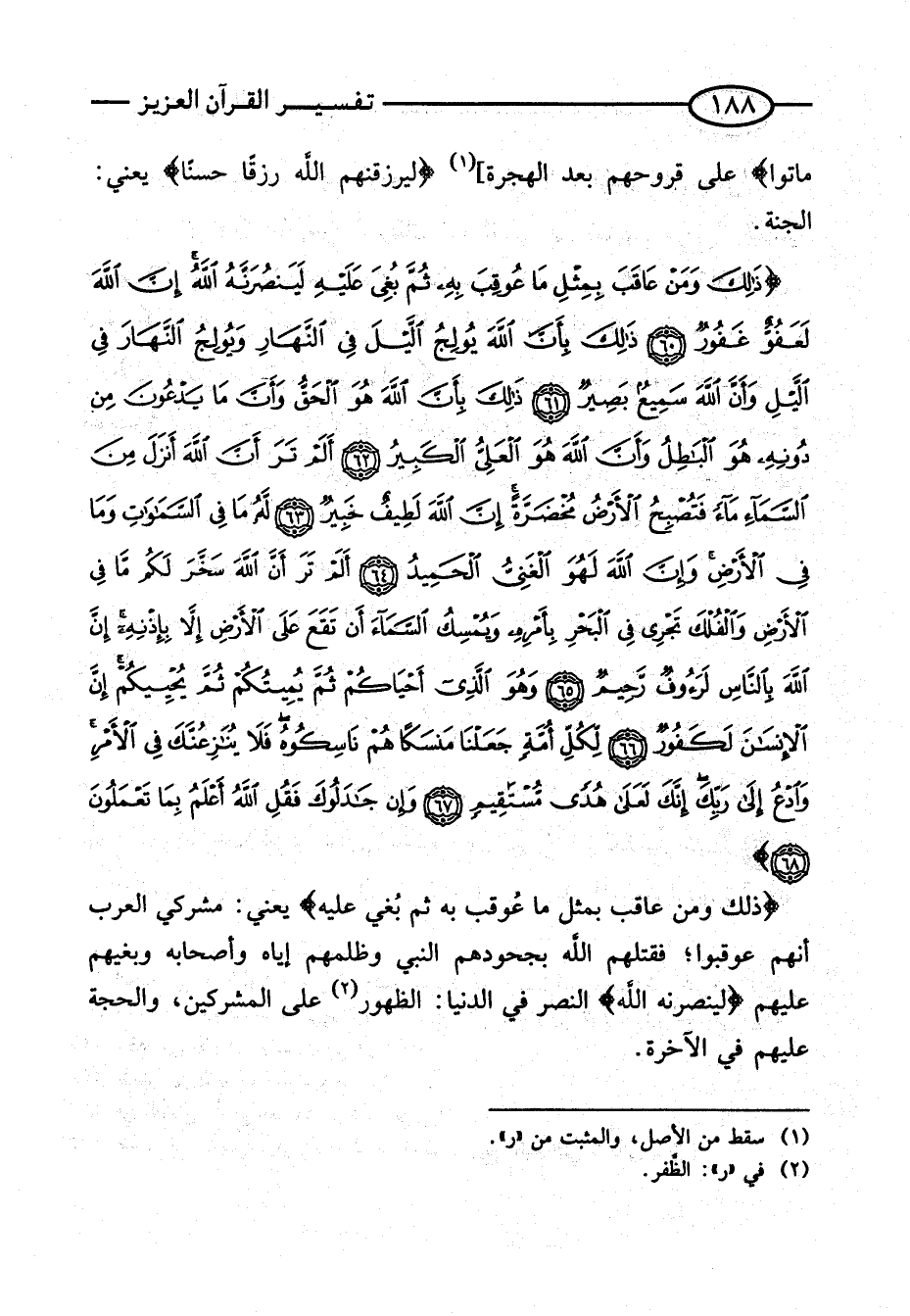 {وَذَلِكَ وَمَنْ عَاقَبَ بِمِثْلِ مَا عُوقِبَ بِهِ ثمَّ بغي عَلَيْهِ} يَعْنِي: مُشْرِكِي الْعَرَبِ أَنَّهُمْ عُوقِبُوا؛ فَقَتَلَهُمُ اللَّهُ بِجُحُودِهِمُ النَّبِيَّ وَظُلْمِهِمْ إِيَّاه وَأَصْحَابه وبغيهم عَلَيْهِم {لينصرنه الله} النَّصْرُ فِي الدُّنْيَا: الظُّهُورُ عَلَى الْمُشْرِكِينَ، وَالْحُجَّةُ عَلَيْهِمْ فِي الْآخِرَةِ.