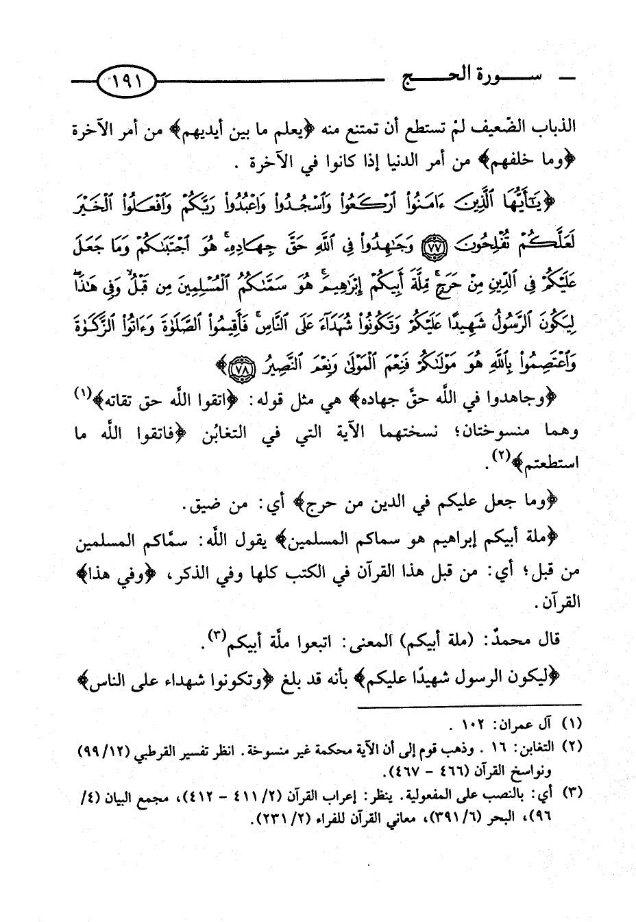 {وَجَاهِدُوا فِي اللَّهِ حَقَّ جِهَادِهِ} هِيَ مِثْلُ قَوْلِهِ: {اتَّقُوا اللَّهَ حق تُقَاته} وَهُمَا مَنْسُوخَتَانِ؛ نَسَخَتْهُمَا الْآيَةُ الَّتِي فِي الْتَغَابُنِ {فَاتَّقُوا اللَّهَ مَا اسْتَطَعْتُم}. {وَمَا جَعَلَ عَلَيْكُمْ فِي الدِّينِ من حرج} أَيْ: مِنْ ضِيقٍ. {مِلَّةَ أَبِيكُمْ إِبْرَاهِيم هُوَ سَمَّاكُم الْمُسلمين} يَقُولُ اللَّهُ: سَمَّاكُمُ الْمُسْلِمِينَ مِنْ قَبْلُ؛ أَيْ: مِنْ قَبْلِ هَذَا الْقُرْآنِ فِي الْكُتُبِ كُلِّهَا وَفِي الذّكر، {وَفِي هَذَا} الْقُرْآنِ.