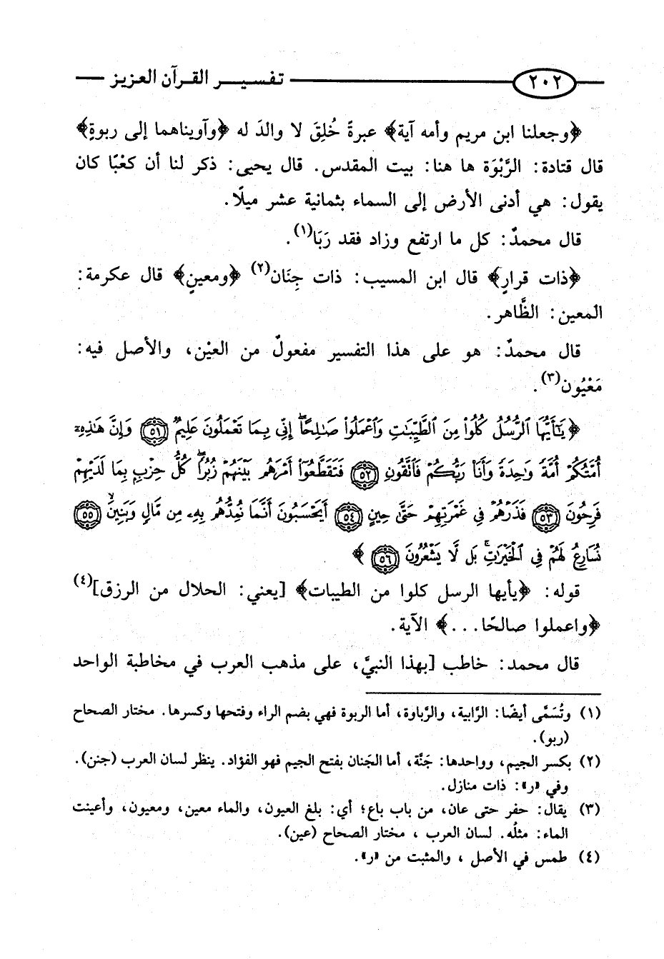 قَالَ مُحَمَّدٌ: كُلُّ مَا ارْتَفَعَ وَزَادَ فَقَدْ رَبًّا. {ذَات قَرَار} قَالَ ابْنُ الْمُسَيِّبِ: ذَاتَ جِنَانٍ {ومعين} قَالَ عِكْرِمَةَ: الْمَعِينُ: الظَّاهِرُ.
