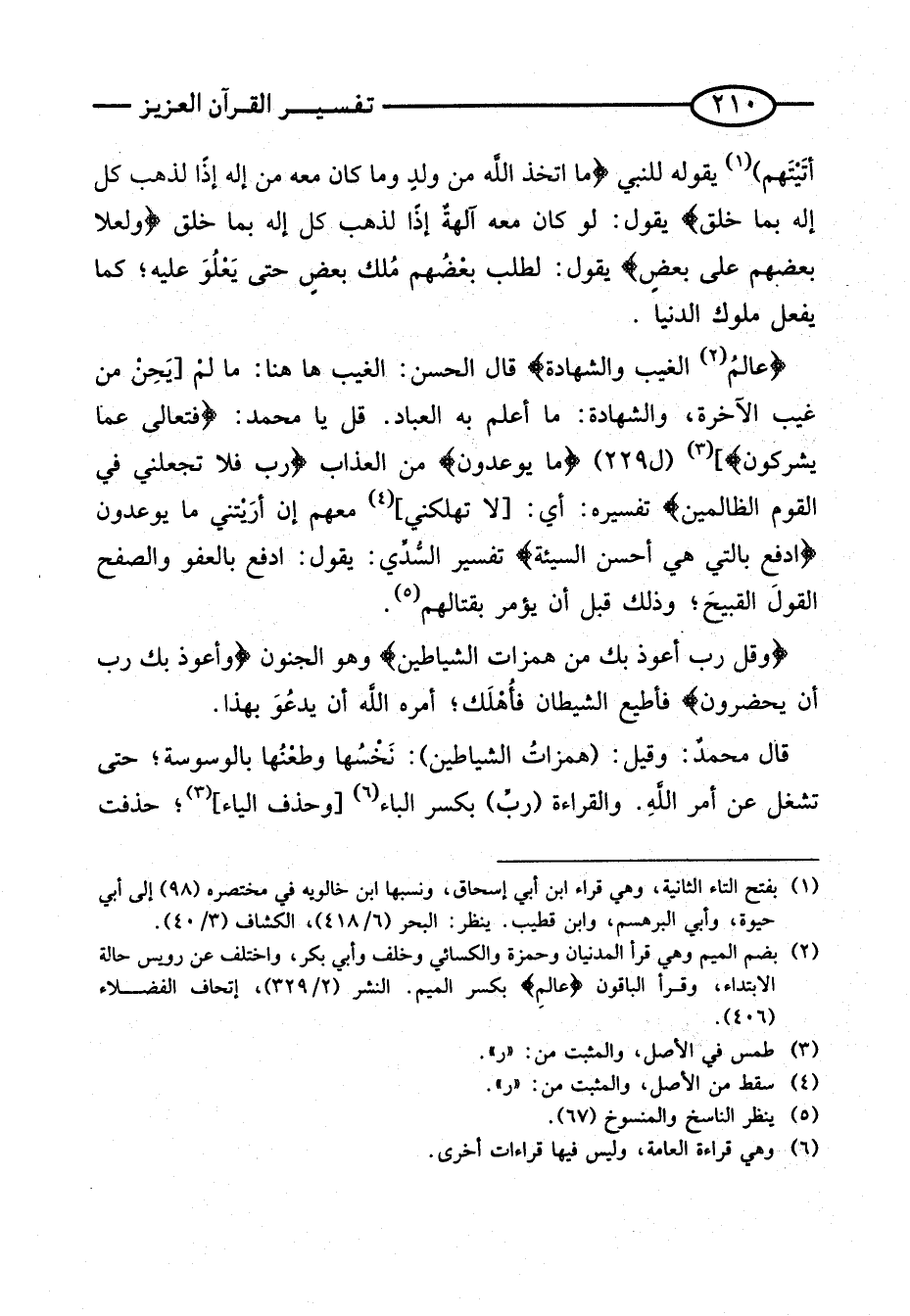 قَالَ مُحَمَّدٌ: وَقيل: (همزات الشَّيَاطِين): نَخْسُهَا وَطَعْنُهَا بِالْوَسْوَسَةِ؛ حَتَّى تُشْغَلَ عَنْ أَمْرِ اللَّهِ. وَالْقِرَاءَةُ (رَبِّ) بِكَسْرِ الْبَاءِ [وَحَذْفِ الْيَاءِ]؛ حُذِفَتِ