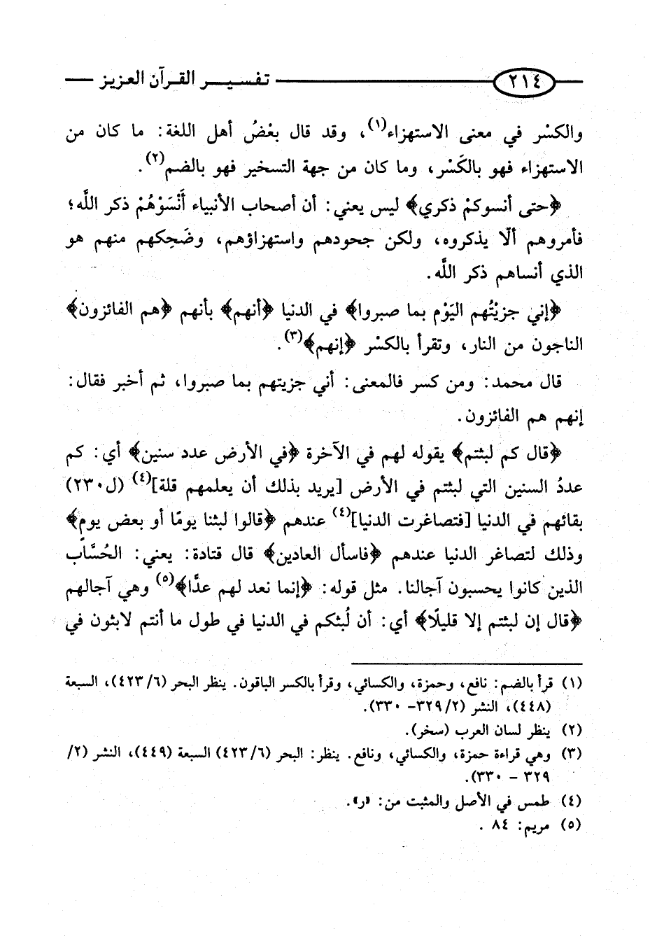 وَالْكَسْرِ فِي مَعْنَى الِاسْتِهْزَاءِ، وَقَدْ قَالَ بَعْضُ أَهْلِ اللُّغَةِ: مَا كَانَ مِنَ الِاسْتِهْزَاءِ فَهُوَ بِالْكَسْرِ، وَمَا كَانَ مِنْ جِهَةِ التَّسْخِيرِ فَهُوَ بِالضَّمِّ. {حَتَّى أَنْسَوْكُمْ ذِكْرِي} لَيْسَ يَعْنِي: أَنَّ أَصْحَابِ الْأَنْبِيَاءِ أَنْسَوْهُمْ ذَكَرَ اللَّهِ؛ فَأَمَرُوهُمْ أَلَّا يذكروه، وَلَكِن جحودهم واستهزاؤهم، وَضَحِكُهُمْ مِنْهُمْ هُوَ الَّذِي أَنْسَاهُمْ ذكر الله.