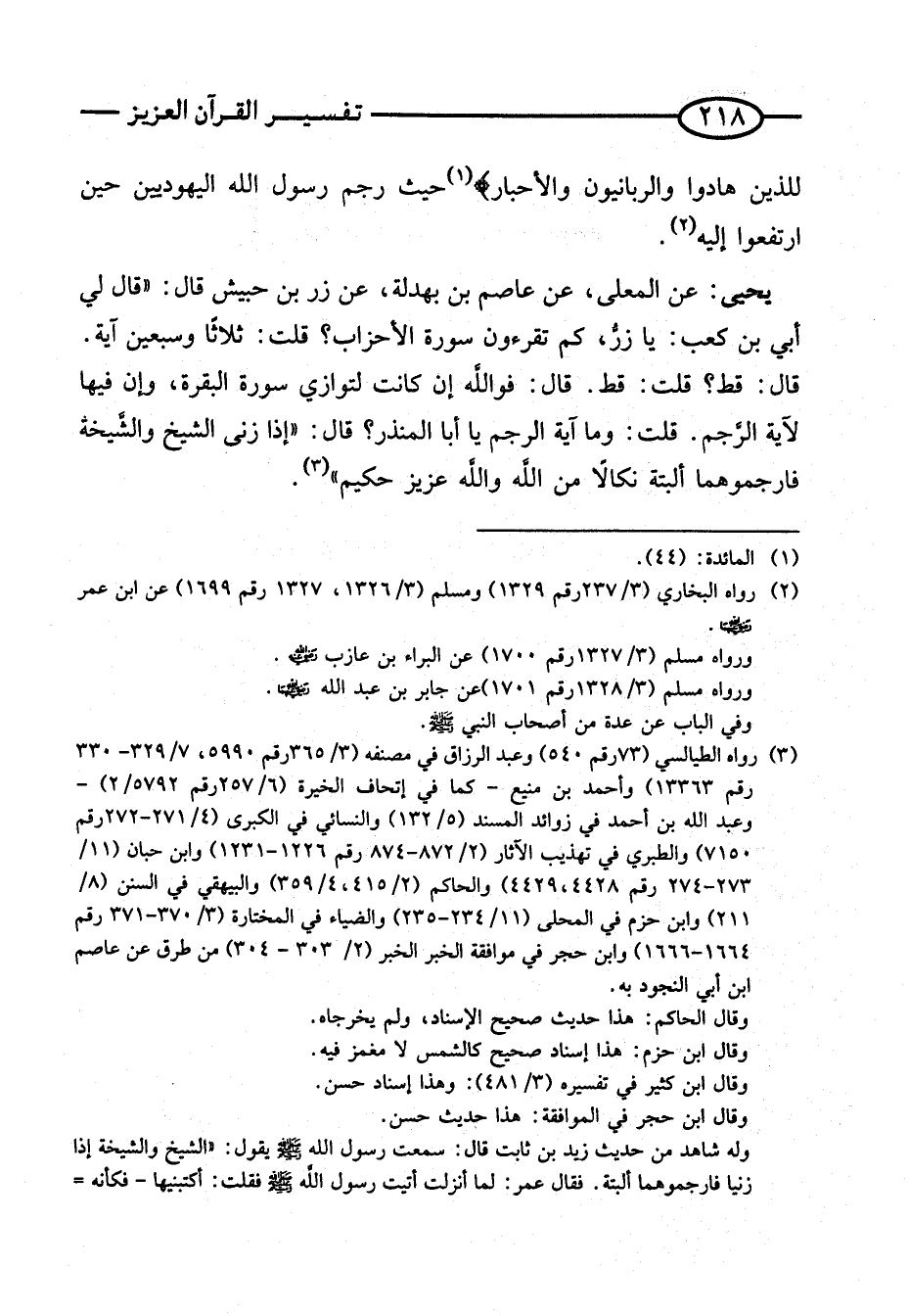 يَحْيَى: عَنِ الْمُعَلَّى، عَنْ عَاصِمِ بْنِ بَهْدَلَةَ، عَنْ زِرِّ بْنِ حُبَيْشٍ قَالَ: " قَالَ لِي أُبَيُّ بْنُ كَعْبٍ: يَا زِرُّ، كَمْ تَقْرَءُونَ سُورَةَ الْأَحْزَابِ؟ قُلْتُ: ثَلَاثًا وَسَبْعِينَ آيَةً. قَالَ: قَطْ؟ قُلْتُ: قَطْ؟ قَالَ: فَوَاللَّهِ إِنْ كَانَتْ لَتُوازِي سُورَةَ الْبَقَرَةِ، وَإِنَّ فِيهَا لَآيَةَ الرَّجْمِ. قُلْتُ: وَمَا آيَةُ الرَّجْمِ يَا أَبَا الْمُنْذِرِ؟ قَالَ: " إِذَا زَنَى الشَّيْخُ وَالشَّيْخَةُ فَارْجُمُوهُمَا الْبَتَّةَ نَكَالًا مِنَ اللَّهِ وَاللَّهُ عَزِيزٌ حَكِيمٌ ".