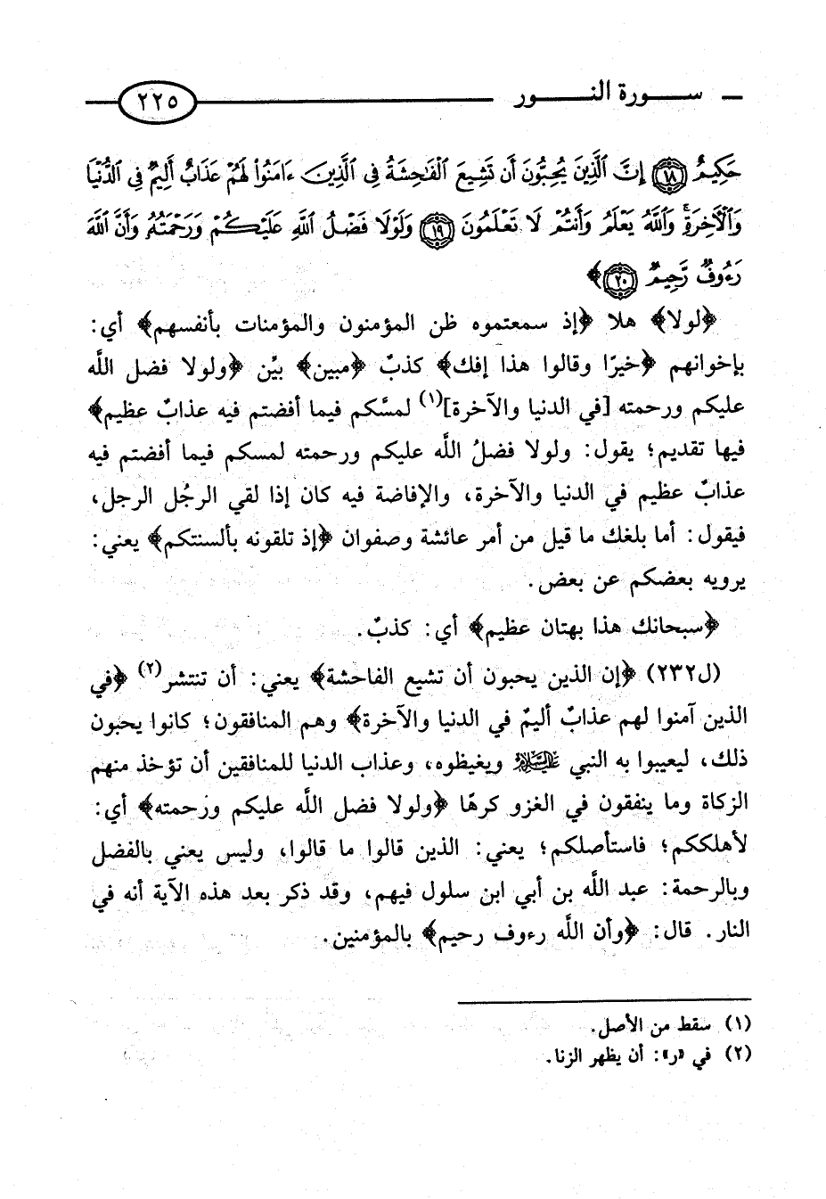 {وَلَوْلا فَضْلُ اللَّهِ عَلَيْكُمْ وَرَحْمَتُهُ} أَيْ: لِأَهْلَكَكُمْ؛ فَاسْتَأْصَلَكُمْ؛ يَعْنِي: الَّذِينَ قَالُوا مَا قَالُوا، وَلَيْسَ يَعْنِي بِالْفَضْلِ وَبِالرَّحْمَةِ: عَبْدَ اللَّهِ بْنَ أُبَيِّ ابْنِ سَلُولٍ فِيهِمْ، وَقَدْ ذكر عبد هَذِهِ الْآيَةِ أَنَّهُ فِي النَّارِ. قَالَ: {وَأَنَّ اللَّهَ رَءُوفٌ رَحِيمٌ} بِالْمُؤْمِنِينَ.