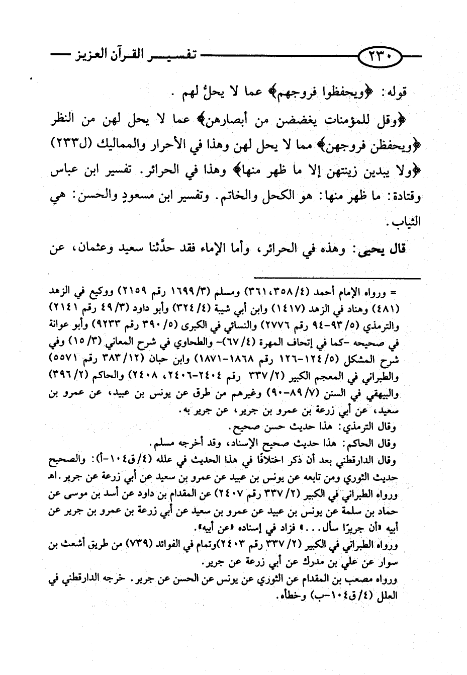 {وَقُلْ لِلْمُؤْمِنَاتِ يَغْضُضْنَ مِنْ أَبْصَارِهِنَّ} عَمَّا لَا يَحِلُّ لَهُنَّ مِنَ النّظر {ويحفظن فروجهن} مِمَّا لَا يَحِلُّ لَهُنَّ وَهَذَا فِي الْأَحْرَار والمماليك (ل 233) {وَلا يُبْدِينَ زِينَتَهُنَّ إِلا مَا ظهر مِنْهَا} وَهَذَا فِي الْحَرَائِرِ. تَفْسِيرُ ابْنِ عَبَّاسٍ وَقَتَادَةَ: مَا ظَهَرَ مِنْهَا: هُوَ الْكُحْلُ وَالْخَاتَمُ. وَتَفْسِيرُ ابْنُ مَسْعُودٍ وَالْحَسَنُ: هِيَ الثِّيَابُ.