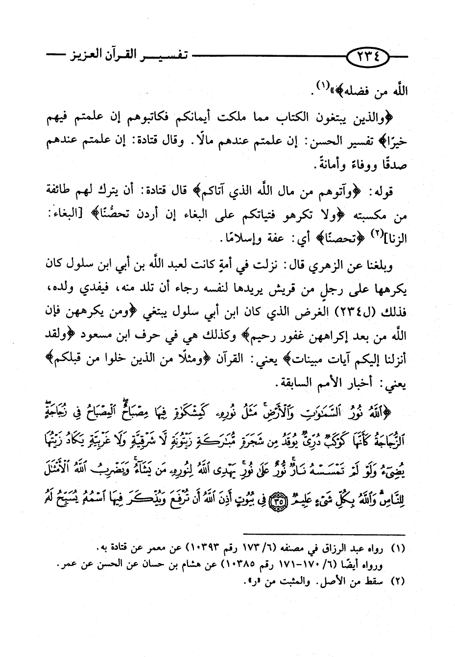 قَوْلُهُ: {وَآتُوهُمْ مِنْ مَالِ اللَّهِ الَّذِي آتَاكُم} قَالَ قَتَادَةُ: أَنْ يَتُرْكَ لَهُمْ طَائِفَة من مكسبته {وَلَا تكرهو فَتَيَاتِكُمْ عَلَى الْبِغَاءِ إِنْ أَرَدْنَ تَحَصُّنًا} [الْبغاء: الزِّنَا] {تَحَصُّنًا} أَيْ: عِفَّةً وَإِسْلَامًا.