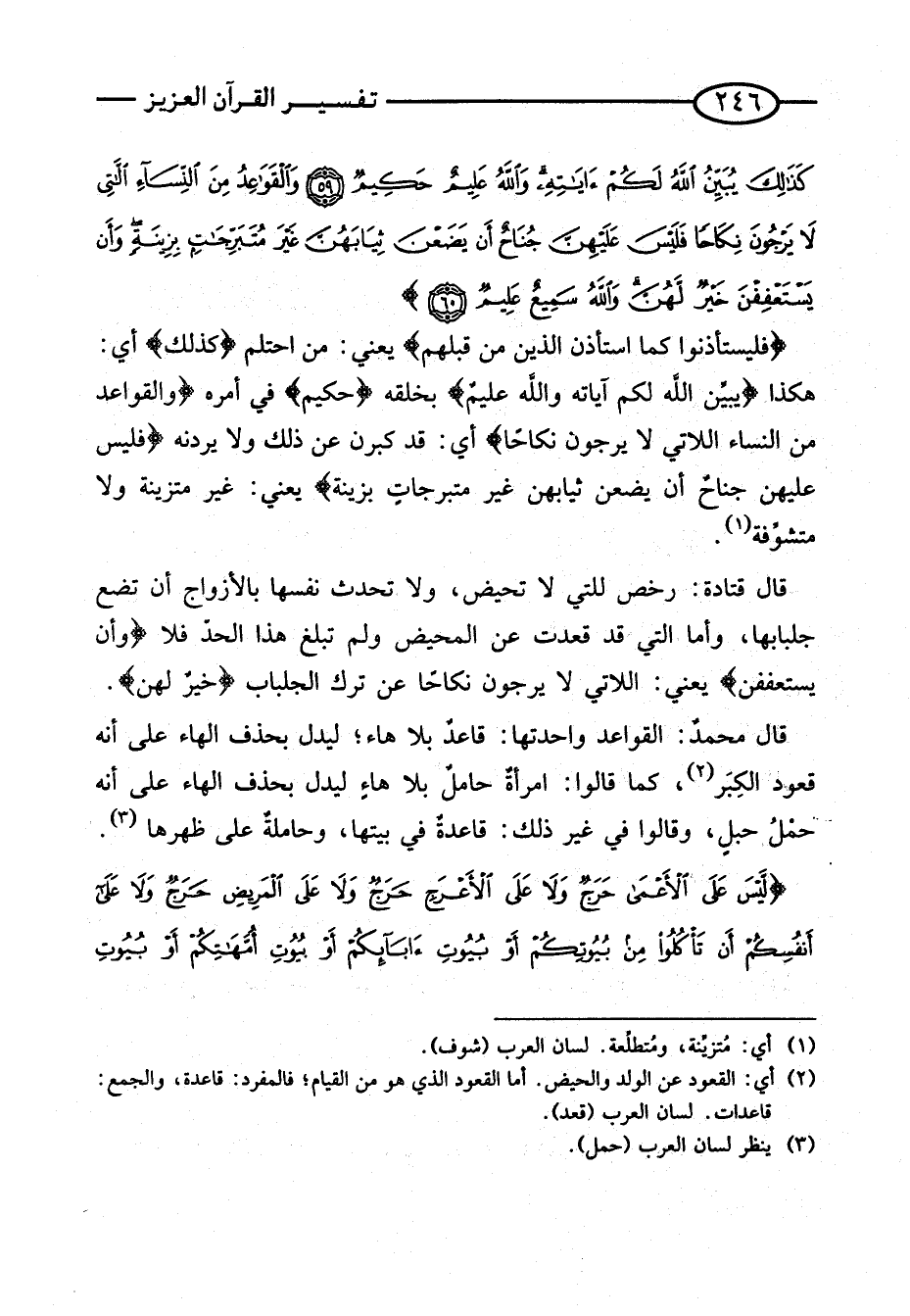 قَالَ مُحَمَّدٌ: الْقَوَاعِدُ وَاحِدَتُهَا: قَاعِدٌ بِلا هَاءٍ؛ لِيُدَلَّ بِحَذْفِ الْهَاءِ عَلَى أَنَّهُ قُعُودُ الْكِبَرِ، كَمَا قَالُوا: امْرَأَةٌ حَامِلٌ بِلا هَاءٍ لِيُدَلَّ بِحَذْفِ الْهَاءِ عَلَى أَنَّهُ حَمْلُ حَبَلٍ، وَقَالُوا فِي غَيْرِ ذَلِكَ: قَاعِدَةٌ فِي بَيْتِهَا، وَحَامِلَةٌ على ظهرهَا.