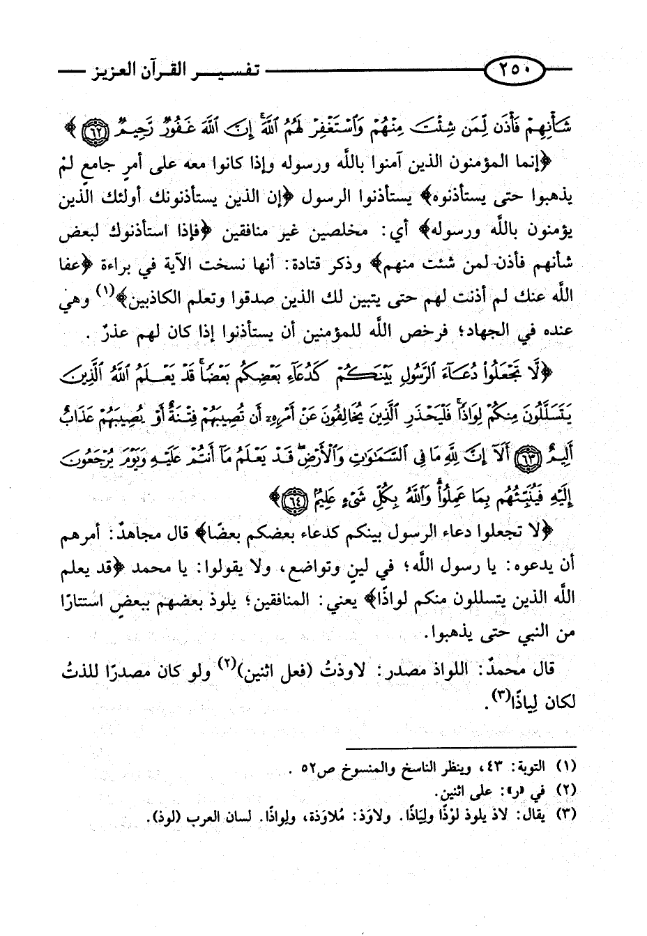 {لَا تَجْعَلُوا دُعَاءَ الرَّسُولِ بَيْنَكُمْ كدعاء بَعْضكُم بَعْضًا} قَالَ مُجَاهِدٌ: أَمْرَهَمُ أَنْ يَدْعُوهُ: يَا رَسُولَ اللَّهِ؛ فِي لِينٍ وَتَوَاضُعٍ، وَلَا يَقُولُوا: يَا مُحَمَّدُ {قَدْ يَعْلَمُ اللَّهُ الَّذِينَ يَتَسَلَّلُونَ مِنْكُم لِوَاذًا} يَعْنِي: الْمُنَافِقِينَ؛ يَلُوذُ بَعْضُهُمْ بِبَعْضٍ اسْتِتَارًا مِنَ النَّبِيِّ حَتَّى يَذْهَبُوا.