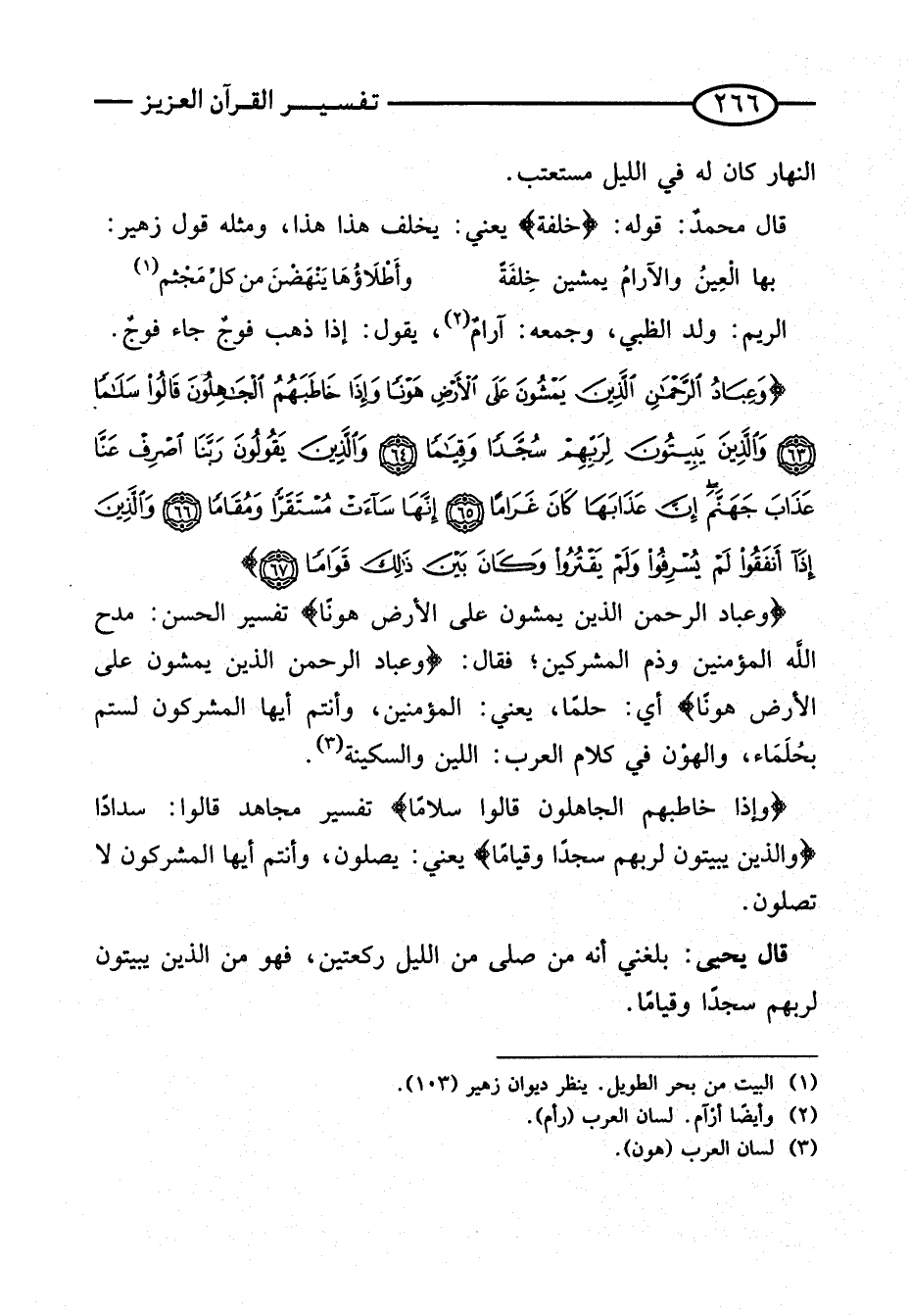 {وَعِبَادُ الرَّحْمَنِ الَّذِينَ يَمْشُونَ عَلَى الأَرْض هونا} تَفْسِيرُ الْحَسَنِ: مَدَحَ اللَّهُ الْمُؤْمِنِينَ وَذَمَّ الْمُشْرِكِينَ؛ فَقَالَ: {وَعِبَادُ الرَّحْمَنِ الَّذِينَ يَمْشُونَ عَلَى الأَرْضِ هَوْنًا} أَيْ: حِلْمًا، يَعْنِي: الْمُؤْمِنِينَ، وَأَنْتُمْ أَيُّهَا الْمُشْرِكُونَ لَسْتُمْ بِحُلَمَاءَ، وَالْهَوْنُ فِي كَلَامِ الْعَرَبِ: اللَّيِنُ وَالسَّكِينَةُ. {وَإِذَا خَاطَبَهُمُ الْجَاهِلُونَ قَالُوا سَلامًا} تَفْسِير مُجَاهِد قَالُوا: سدادا