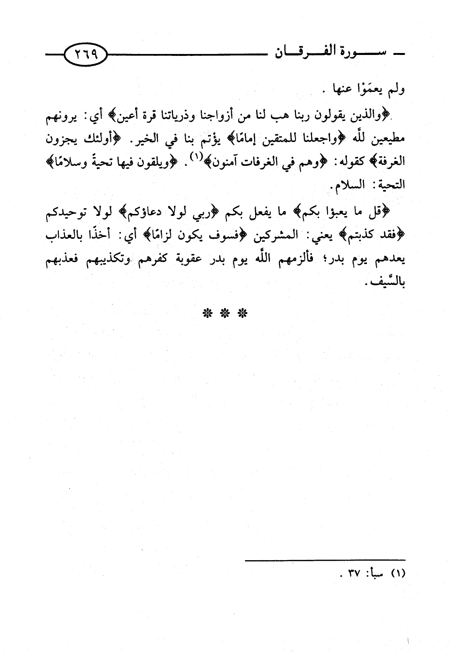 {وَالَّذِينَ يَقُولُونَ رَبَّنَا هَبْ لَنَا مِنْ أَزْوَاجِنَا وَذُرِّيَّاتِنَا قُرَّةَ أَعْيُنٍ} أَيْ: يَرَوْنَهُمْ مُطِيعِينَ لِلَّهِ {وَاجْعَلْنَا لِلْمُتقين إِمَامًا} يؤتم بِنَا فِي الْخَيْر.