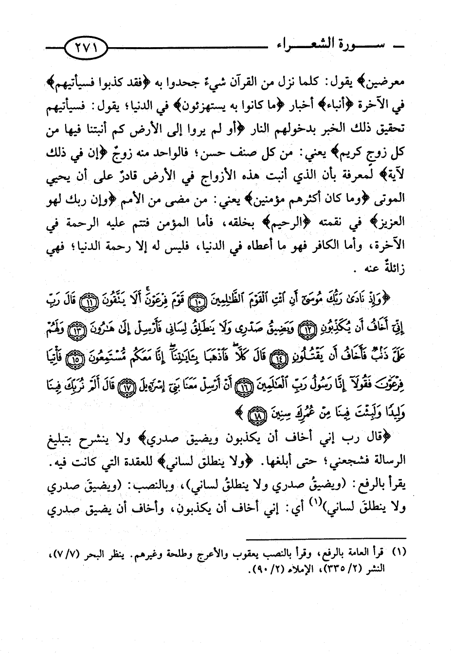 {قَالَ رَبِّ إِنِّي أَخَافُ أَنْ يكذبُون ويضيق صَدْرِي} وَلَا ينشرح يتبليغ الرِّسَالَةِ فَشَجِّعْنِي؛ حَتَّى أُبَلِّغَهَا. {وَلا ينْطَلق لساني} لِلْعُقْدَةِ الَّتِي كَانَتْ فِيهِ. يُقْرَأُ بِالرَّفْعِ: (وَيَضِيقُ صَدْرِي وَلا يَنْطَلِقُ لساني)، وَبِالنَّصْبِ: (وَيَضِيقَ صَدْرِي وَلَا يَنْطَلِقَ لِسَانِي) أَيْ: إِنِّي أَخَافُ أَنْ يُكَذِّبُونَ، وَأَخَافُ أَنْ يَضِيقَ صَدْرِي