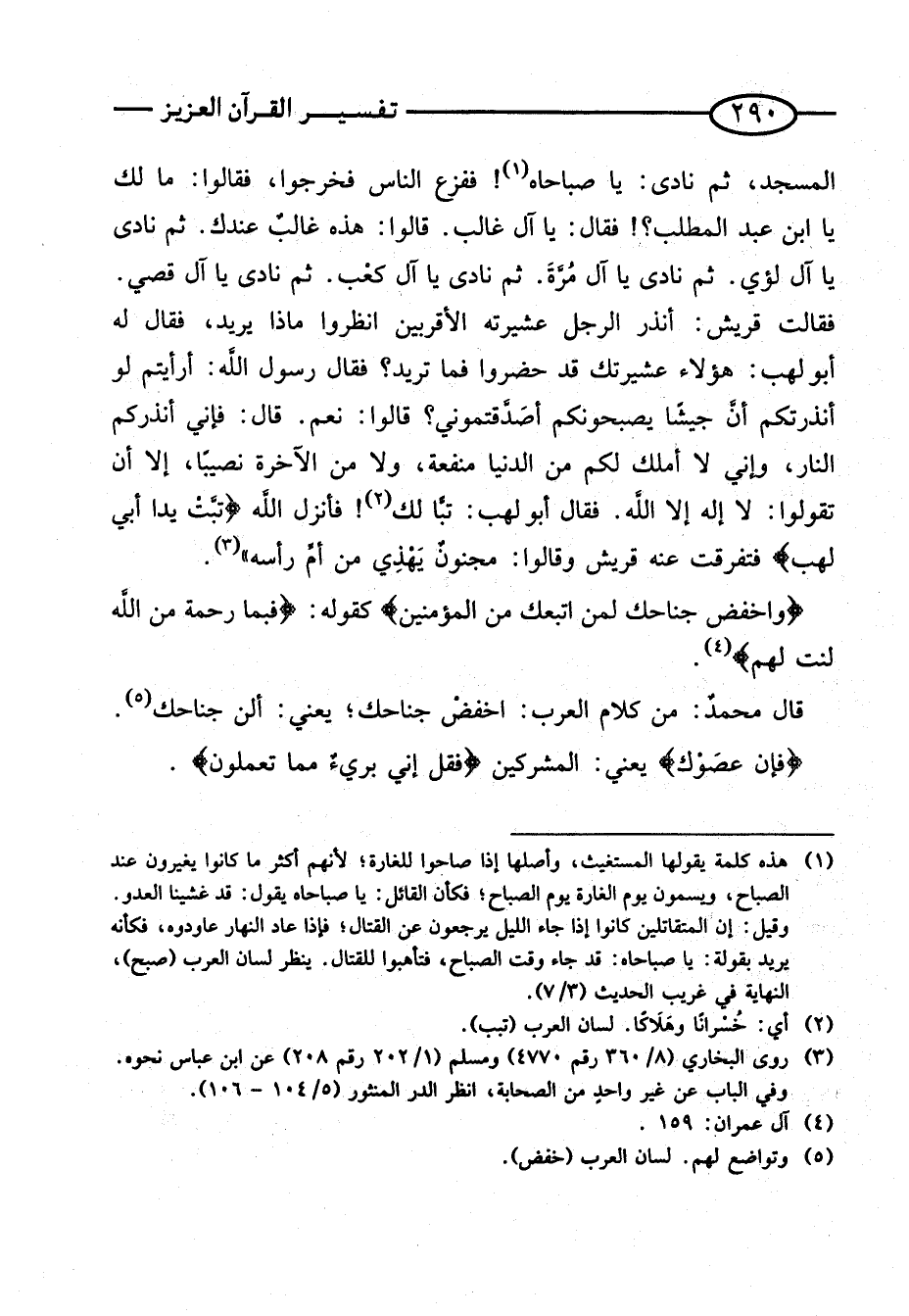 الْمَسْجِدِ، ثُمَّ نَادَى: يَا صَبَاحَاهُ {فَفَزِعَ النَّاسُ فَخَرَجُوا، فَقَالُوا: مَا لَكَ يَا ابْنَ عَبْدَ الْمُطَّلِبِ؟} فَقَالَ: يَا آلَ غَالِبٍ. قَالُوا: هَذِهِ غَالِبٌ عِنْدَكَ. ثُمَّ نَادَى يَا آلَ لُؤَيٍّ. ثُمَّ نَادَى يَا آلَ مُرَّةَ. ثُمَّ نَادَى يَا آلَ كَعْبٍ. ثُمَّ نَادَى يَا آلَ قُصَيٍّ. فَقَالَتْ قُرَيْشٌ: أَنْذَرَ الرَّجُلُ عَشِيرَتَهُ الْأَقْرَبِينَ انْظُرُوا مَاذَا يُرِيدُ، فَقَالَ لَهُ أَبُو لَهَبٍ: هَؤُلَاءِ عَشِيرَتُكَ قَدْ حَضَرُوا فَمَا تُرِيدُ؟ فَقَالَ رَسُولُ اللَّهِ: أَرَأَيْتُمْ لَوْ أَنْذَرْتُكُمْ أَنَّ جَيْشًا يُصْبِحُونَكُمْ أَصَدَّقْتُمُونِي؟ قَالُوا: نَعَمْ. قَالَ: فَإِنِّي أُنْذِرُكُمُ النَّارَ، وَإِنِّي لَا أَمْلِكُ لَكُمْ مِنَ الدُّنْيَا مَنْفَعَةً، وَلَا مِنَ الْآخِرَةِ نَصِيبًا، إِلَّا أَنْ تَقُولُوا: لَا إِلَهَ إِلَّا اللَّهُ. فَقَالَ أَبُو لَهَبٍ: تَبًّا لَكَ! فَأَنْزَلَ اللَّهُ {تَبَّتْ يَدَا أبي لَهب} فَتَفَرَّقَتْ عَنْهُ قُرَيْشٌ وَقَالُوا: مَجْنُونٌ يهذي من أم رَأسه ".