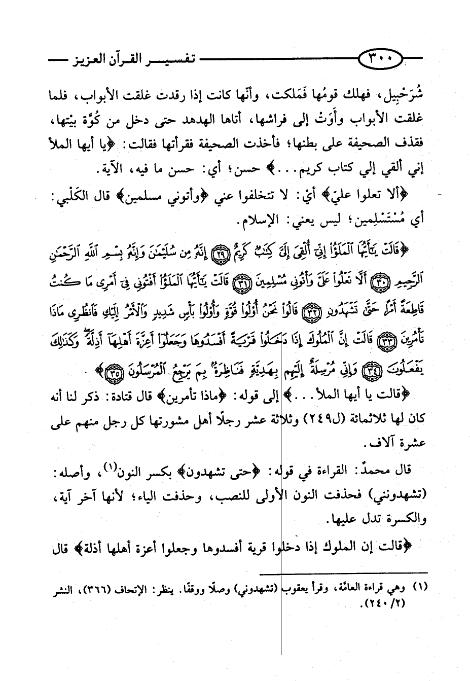 شُرُحْبِيلَ، فَهَلَكَ قَوْمُهَا فَمَلَكَتْ، وَأَنَّهَا كَانَتْ إِذَا رَقَدَتْ غَلَّقَتِ الْأَبْوَابَ، فَلَمَّا غَلَّقَتِ الْأَبْوَابَ وَأَوَتْ إِلَى فِرَاشِهَا، أَتَاهَا الْهُدْهُدُ حَتَّى دَخَلَ مِنْ كُوَّةِ بَيْتِهَا، فَقَذَفَ الصَّحِيفَةَ عَلَى بَطْنِهَا؛ فَأَخَذَتِ الصَّحِيفَةَ فَقَرَأَتْهَا فَقَالَت: {يَا أَيهَا الْمَلأُ إِنِّي أُلْقِيَ إِلَيَّ كِتَابٌ كريم} حَسَنٌ؛ أَيْ: حَسَنٌ مَا فِيهِ، الْآيَة. {أَلا تعلوا عَليّ} أَيْ: لَا تَتَخَلَّفُوا عَنِّي {وَأْتُونِي مُسلمين} قَالَ الْكَلْبِيُّ: أَيْ مُسْتَسْلِمِينَ؛ لَيْسَ يَعْنِي: الْإِسْلَام.