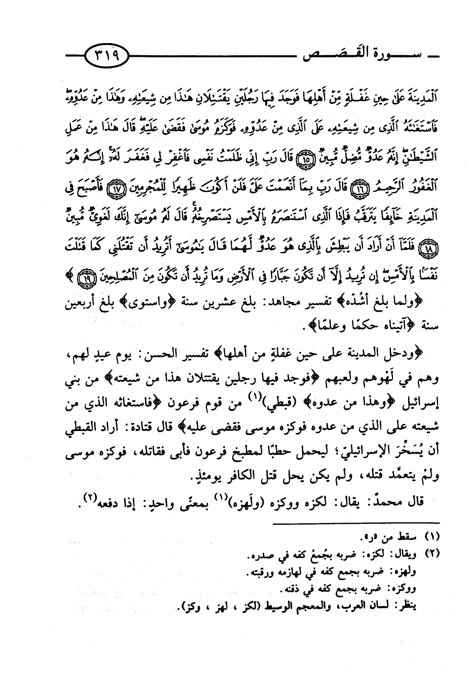 {وَدَخَلَ الْمَدِينَةَ عَلَى حِينِ غَفْلَةٍ من أَهلهَا} تَفْسِيرُ الْحَسَنِ: يَوْمَ عِيدٍ لَهُمْ، وَهُمْ فِي لَهْوِهِمْ وَلَعِبِهِمْ {فَوَجَدَ فِيهَا رَجُلَيْنِ يَقْتَتِلانِ هَذَا مِنْ شيعته} مَنْ بَنِي إِسْرَائِيلَ {وَهَذَا مِنْ عدوه} (قِبْطِيٌّ) مِنْ قَوْمِ فِرْعَوْنَ {فَاسْتَغَاثَهُ الَّذِي مِنْ شِيعَتِهِ عَلَى الَّذِي مِنْ عَدُوِّهِ فَوَكَزَهُ مُوسَى فَقَضَى عَلَيْهِ} قَالَ قَتَادَةُ: أَرَادَ الْقِبْطِيُّ أَنْ يُسَخِّرَ الْإِسْرَائِيلِيَّ؛ لِيَحْمِلَ حَطَبًا لِمَطْبَخِ فِرْعَوْنَ فَأَبَى فَقَاتَلَهُ، فَوَكَزَهُ مُوسَى وَلم يتَعَمَّد قَتْلَهُ، وَلَمْ يَكُنْ يَحِلُّ قَتْلَ الْكَافِرِ يَوْمَئِذٍ.