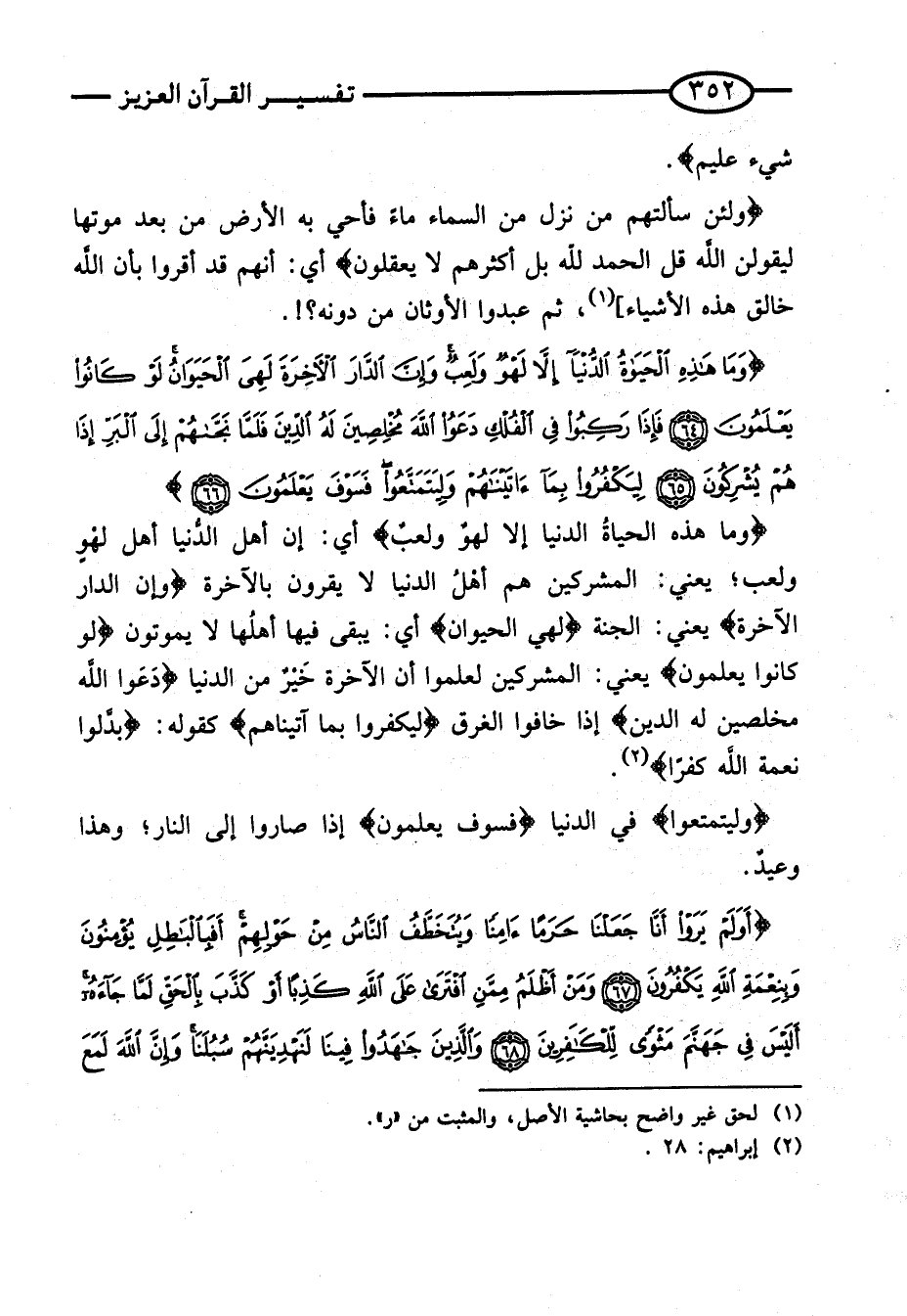} (وَلَئِنْ سَأَلْتَهُمْ مَنْ نَزَّلَ مِنَ السَّمَاء مَاء فأحي بِهِ الأَرْضَ مِنْ بَعْدِ مَوْتِهَا لَيَقُولُنَّ اللَّهُ قُلِ الْحَمْدُ لِلَّهِ بل أَكْثَرهم لَا يعْقلُونَ} أَيْ: أَنَّهُمْ قَدْ أَقَرُّوا بِأَنَّ اللَّهَ خَالِقُ هَذِهِ الْأَشْيَاءِ]، ثُمَّ عبدُوا الْأَوْثَان من دونه؟!.