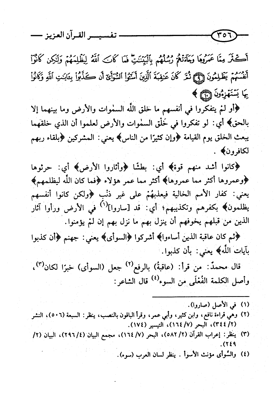 قَالَ مُحَمَّدٌ: من قَرَأَ: (عَاقِبَة) بِالرَّفْع جعل (السوأى) خَبَرًا لِكَانَ، وَأَصْلُ الْكَلِمَةِ الْفُعْلَى مِنَ السُّوْءِ قَالَ الشَّاعِرُ: