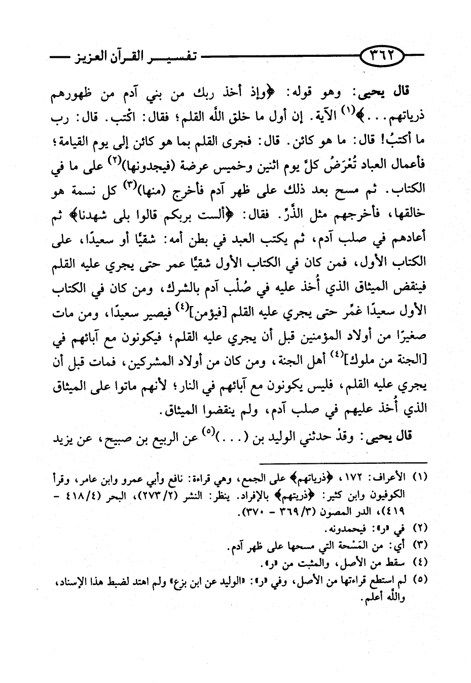 قَالَ يَحْيَى: وَهْوَ قَوْلُهُ: {وَإِذْ أَخَذَ رَبُّكَ مِنْ بَنِي آدَمَ من ظُهُورهمْ ذرياتهم} الْآيَةُ. إِنَّ أَوَّلَ مَا خَلَقَ اللَّهُ الْقَلَمُ؛ فَقَالَ: اكْتُبْ. قَالَ: رَبِّ مَا أَكْتُبُ! قَالَ: مَا هُوَ كَائِنٌ. قَالَ: فَجَرَى الْقَلَمُ بِمَا هُوَ كَائِنٌ إِلَى يَوْمِ الْقِيَامَةِ؛ فَأَعْمَالُ الْعِبَادِ تُعْرَضُ كُلَّ يَوْم اثْنَيْنِ وَخمسين عَرْضَةً (فَيَجِدُونَهَا) عَلَى مَا فِي الْكِتَابِ. ثُمَّ مَسَحَ بَعَدَ ذَلِكَ عَلَى ظَهْرِ آدَمَ فَأَخْرَجَ (مِنْهَا) كُلَّ نَسْمَةٍ هُوَ خَالِقُهَا، فَأَخْرَجَهُمْ مِثْلَ الذَّرِّ. فَقَالَ: {أَلَسْتُ بِرَبِّكُمْ قَالُوا بلَى شَهِدنَا} ثُمَّ أَعَادَهُمْ فِي صُلْبِ آدَمَ، ثُمَّ يَكْتُبُ الْعَبْدَ فِي بَطْنِ أُمِّهِ: شَقِيًّا أَوْ سَعِيدًا، عَلَى الْكِتَابِ الْأَوَّلِ، فَمَنْ كَانَ فِي الْكِتَابِ الْأَوَّلِ شَقِيًّا عُمِّرَ حَتَّى يَجْرِيَ عَلَيْهُ الْقَلَمُ فَيَنْقُضُ الْمِيثَاقَ الَّذِي أُخِذَ عَلَيْهِ فِي صُلْبِ آدَمَ بِالشِّرْكِ، وَمَنْ كَانَ فِي الْكتاب الأول سعيدا غمر حَتَّى يَجْرِيَ عَلَيْهِ الْقَلَمُ [فَيُؤْمِنَ] فَيَصِيرُ سَعِيدًا، وَمَنْ مَاتَ صَغِيرًا مِنْ أَوْلَادِ الْمُؤْمِنِينَ قَبْلَ أَنْ يجْرِي عَلَيْهِ الْقَلَم؛ فيكونون من آبَائِهِمْ فِي [الْجَنَّةِ مِنْ مُلُوكِ] أَهْلِ الْجَنَّةِ، وَمَنْ كَانَ مِنْ أَوْلَادِ الْمُشْرِكِينَ، فَمَاتَ قَبْلَ أَنْ يَجْرِيَ عَلَيْهِ الْقَلَمُ، فَلَيْسَ يَكُونُونُ مَعَ آبَائِهِمْ فِي النَّارِ؛ لِأَنَّهُمْ مَاتُوا عَلَى الْمِيثَاقِ الَّذِي أُخِذَ عَلَيْهِمْ فِي صُلْبِ آدَمَ، وَلَمْ يَنْقُضُوا الْمِيَثَاقَ.
