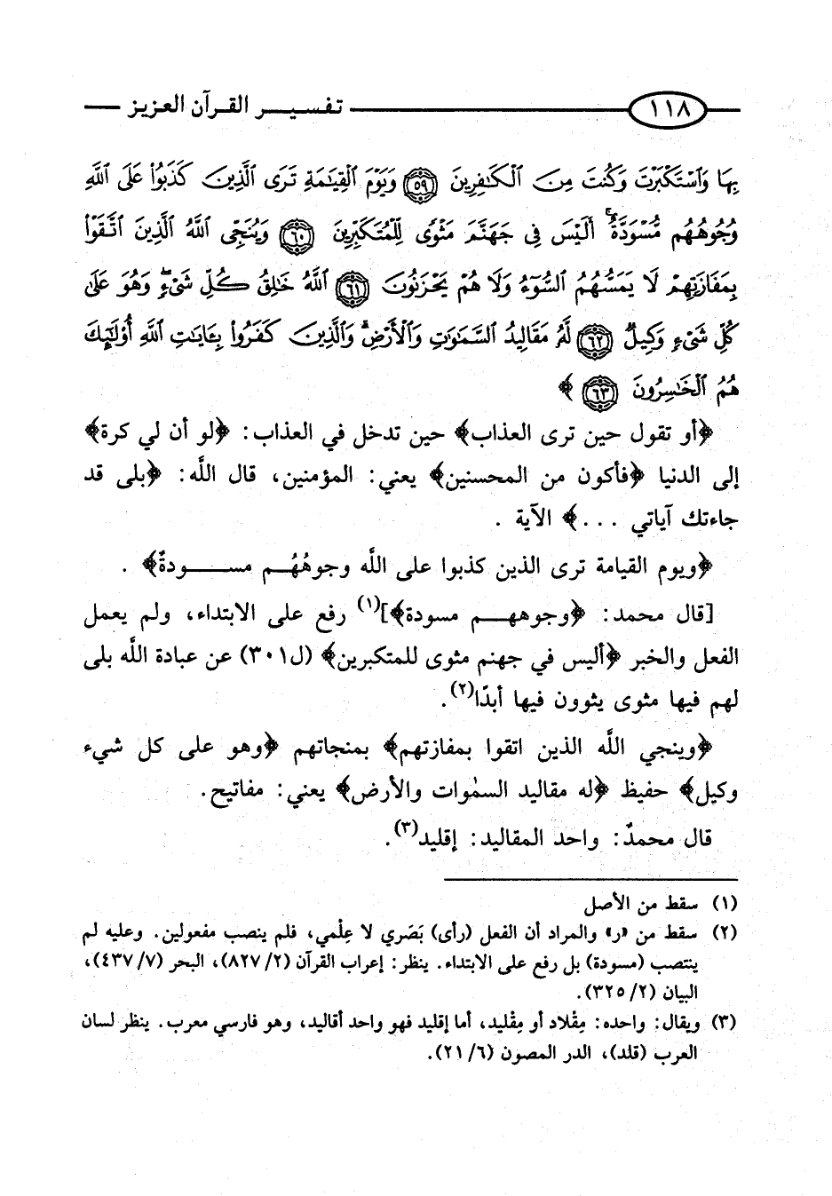 [قَالَ مُحَمَّد: {وُجُوههم مسودة} رفع عَلَى الِابْتِدَاء , وَلم يعْمل الْفِعْل وَالْخَبَر {أَلَيْسَ فِي جَهَنَّمَ مثوى للمتكبرين} (ل 301) عَن عبَادَة اللَّه بلَى لَهُم فِيهَا مثوى يثوون فِيهَا أبدا.