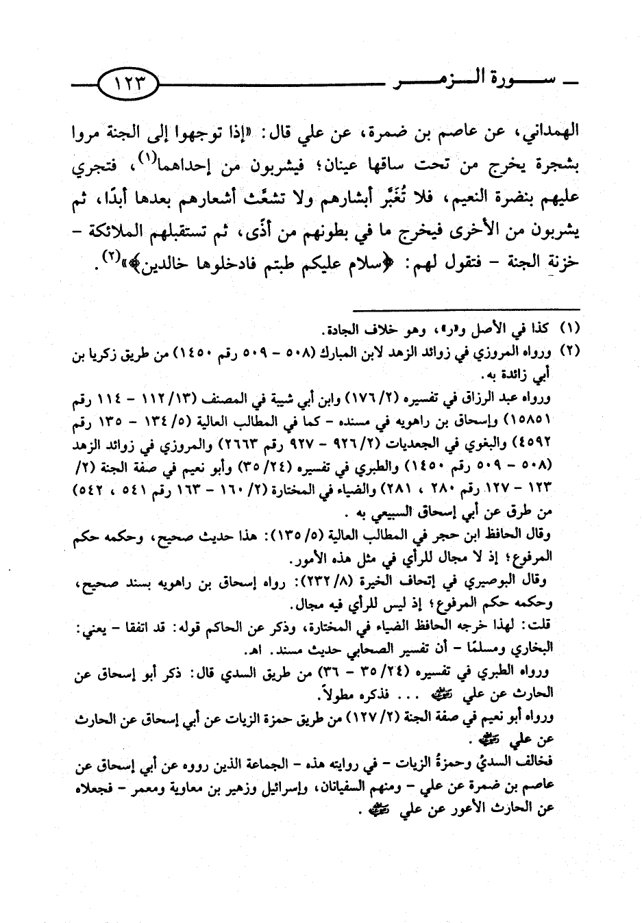الْهَمْدَانِيِّ , عَنْ عَاصِمِ بْنِ ضَمْرَةَ , عَنْ عَلِيٍّ قَالَ: " إِذَا تَوَجَّهُوا إِلَى الْجَنَّةِ مَرُّوا بِشَجَرَةٍ يَخْرُجُ مِنْ تَحْتِ سَاقِهَا عَيْنَانِ؛ فَيَشْرَبُونَ مِنْ إِحْدَاهِمَا , فَتَجْرِي عَلَيْهِمْ بِنَضْرَةِ النَّعِيمِ , فَلا تُغَبَّرُ أَبْشَارُهُمْ وَلا تُشَعَّثُ أَشْعَارُهُمْ بَعْدَهَا أَبَدًا , ثُمَّ يَشْرَبُونَ مِنَ الأُخْرَى فَيَخْرُجُ مَا فِي بُطُونِهِمْ مِنْ أَذًى , ثُمَّ تَسْتَقْبِلُهُمُ الْمَلائِكَةُ - خَزَنَةُ الْجَنَّةِ - فَتَقُولُ لَهُمْ: {سَلامٌ عَلَيْكُمْ طِبْتُمْ فَادْخُلُوهَا خَالِدين}.