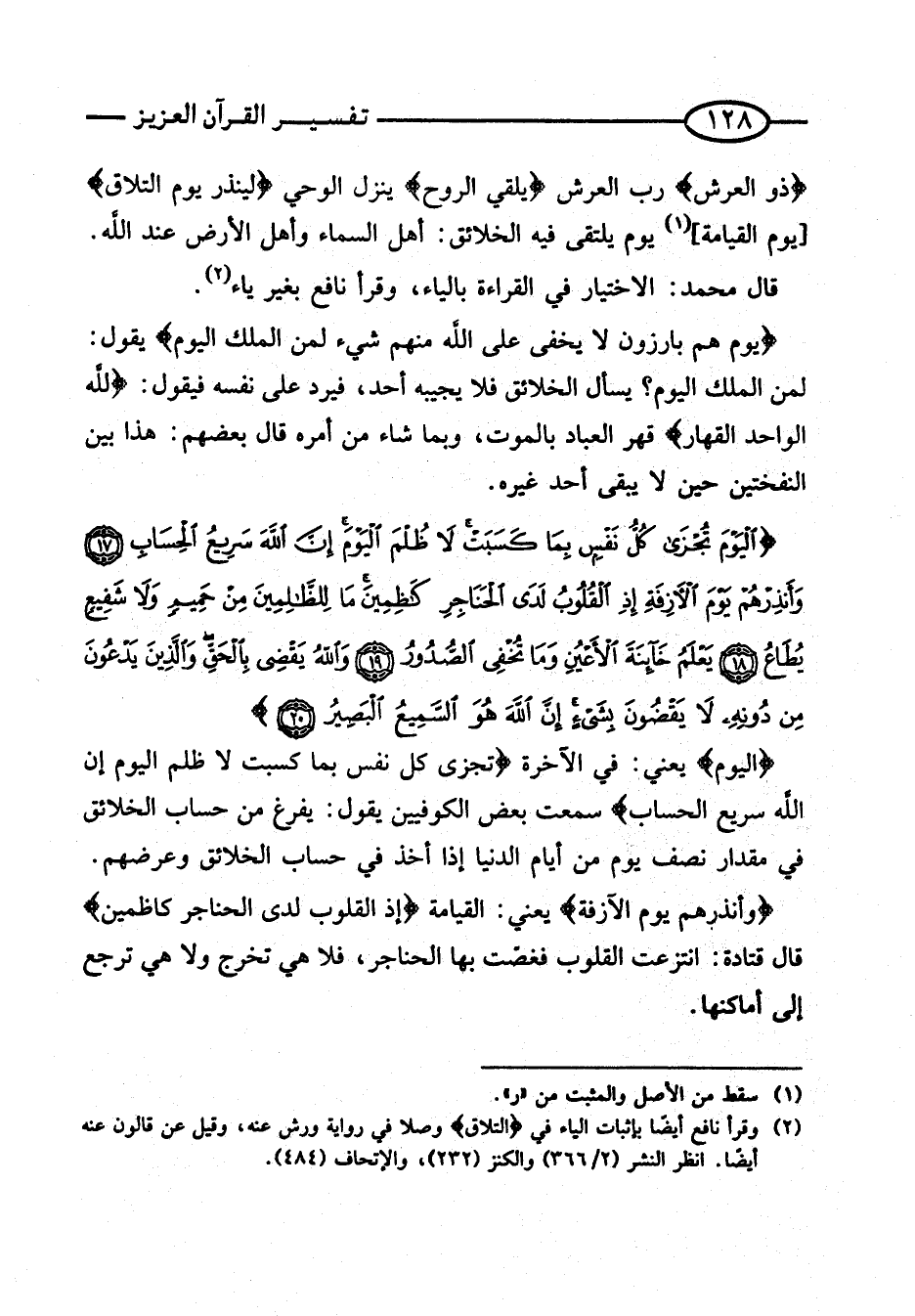 {ذُو الْعَرْش} رب الْعَرْش {يلقِي الرّوح} ينزل الْوَحْي {لِيُنْذِرَ يَوْمَ التَّلاقِ} [يَوْم الْقِيَامَة] يَوْم يلتقي فِيهِ الْخَلَائق: أهل السَّمَاء وَأهل الأَرْض عِنْد اللَّه.
