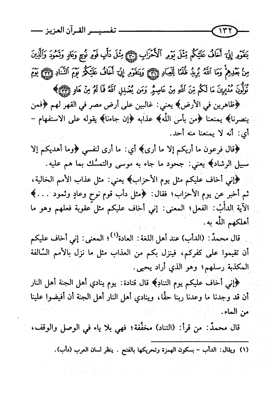 2 - ! (مِثْلَ دَأْبِ قَوْمِ نُوحٍ وَعَادٍ وَثَمُودَ} الْآيَة الدأْبُ: الْفِعْل؛ الْمَعْنى: إِنِّي أَخَاف عَلَيْكُم مثل عُقُوبَة فعلهم وَهُوَ مَا أهلكهم اللَّه بِهِ.