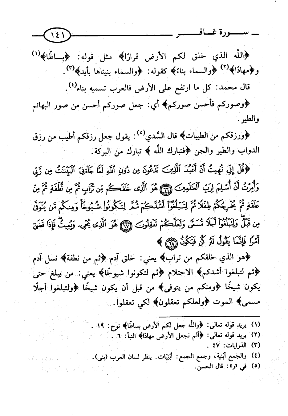 {اللَّهُ الَّذِي خلَقَ لَكُمُ الأَرْضَ قَرَارًا} مثل قَوْله: {بساطا} و {مهادا} {وَالسَّمَاء بِنَاء} كَقَوْلِه: {وَالسَّمَاء بنيناها بأيد}.