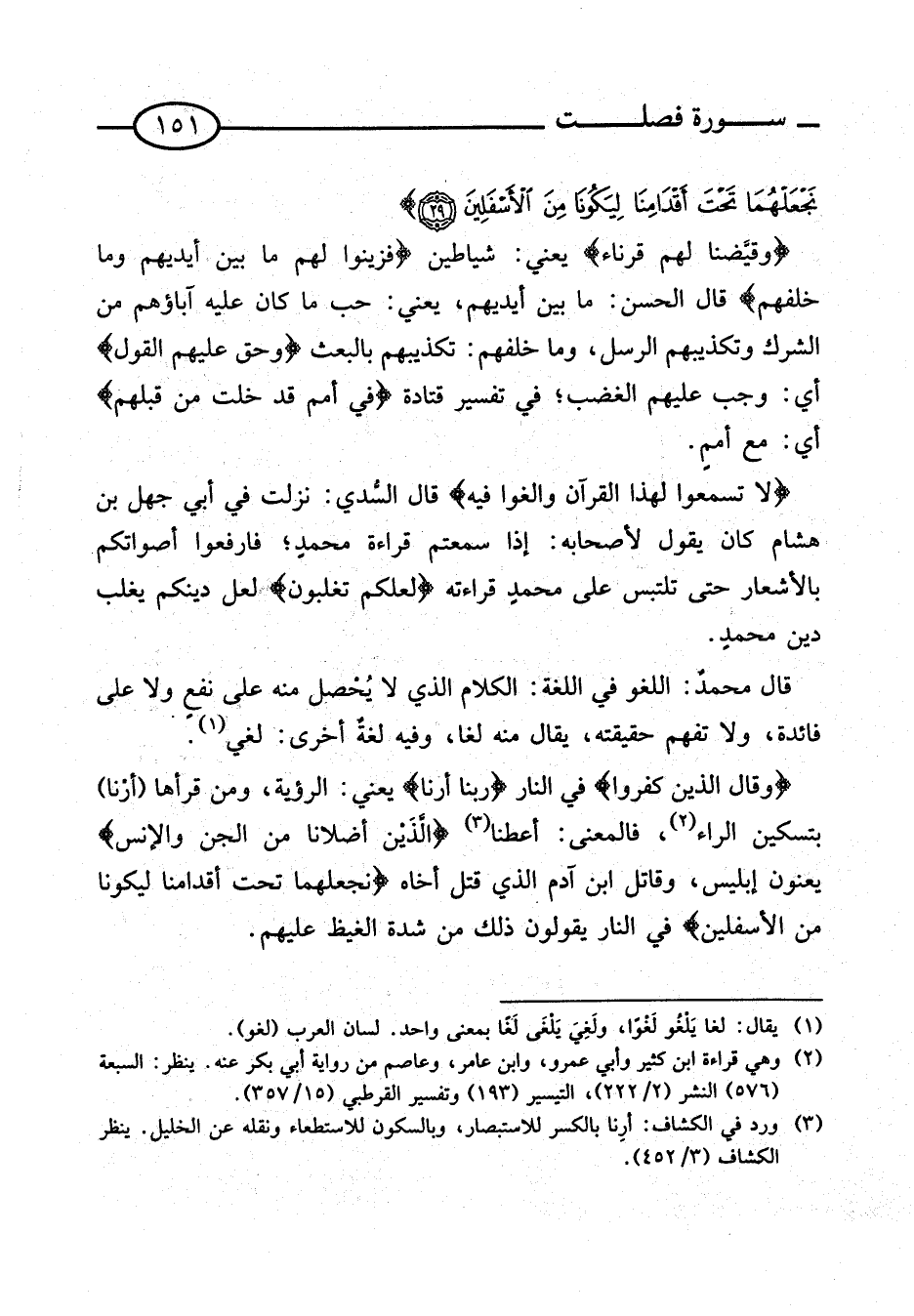 {لَا تَسْمَعُوا لهَذَا الْقُرْآن والغوا فِيهِ} قَالَ السُّدي: نزلت فِي أَبِي جهل بْن هِشَام كَانَ يَقُولُ لأَصْحَابه: إِذا سَمِعْتُمْ قِرَاءَة محمدٍ؛ فارفعوا أَصْوَاتكُم بالأشعار حَتَّى تَلْتَبِس عَلَى محمدٍ قِرَاءَته {لَعَلَّكُمْ تَغْلِبُونَ} لَعَلَّ دينكُمْ يغلب دين محمدٍ.