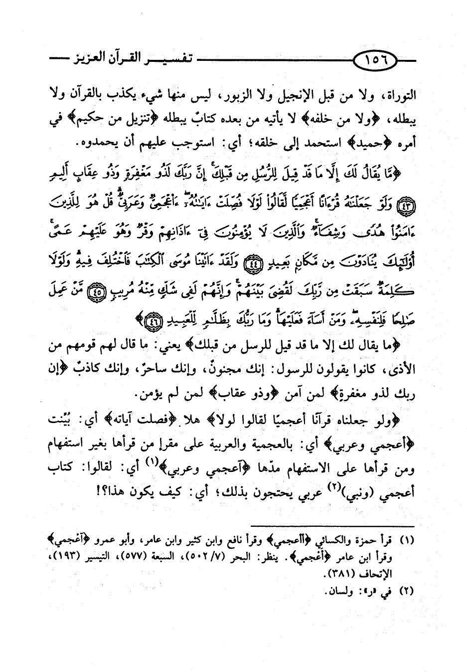{وَلَو جَعَلْنَاهُ قُرْآنًا أعجميا لقالوا لَوْلَا} هلا {فصلت آيَاته} أَي: بيّنت {أعجمي وعربي} أَي: بالعجمية والعربية على مقرأ من قَرَأَهَا بِغَيْر اسْتِفْهَام وَمن قَرَأَهَا على الِاسْتِفْهَام مدّها {أعجمي وعربي} أَي: لقالوا: كتاب أعجمي (وَنَبِي) عَرَبِيّ يحتجون بذلك؛ أَي: كَيفَ يكون هَذَا؟!