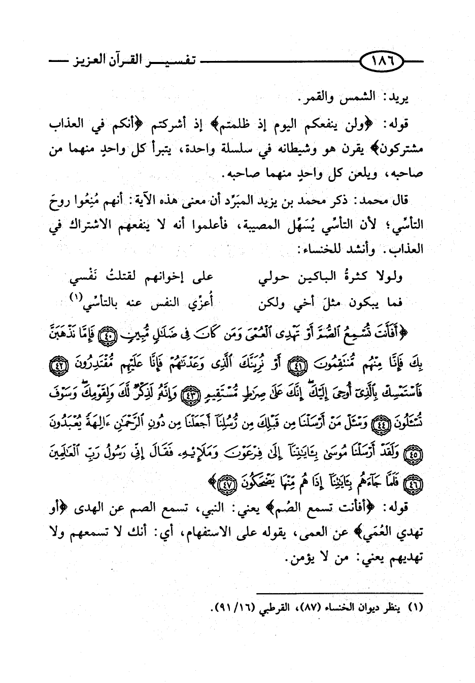 قَالَ مُحَمَّد: ذكر مُحَمَّد بن يزِيد المبَرِّد أَن معنى هَذِه الْآيَة: أَنهم مُنِعُوا روحَ التأسِّي؛ لِأَن التأسِّي يُسَهِّل الْمُصِيبَة، فأعلموا أَنه لَا يَنْفَعهُمْ الِاشْتِرَاك فِي الْعَذَاب. وَأنْشد للخنساء.
