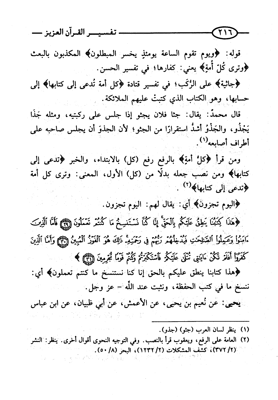 {جاثية} على الرُّكَب؛ فِي تَفْسِير قَتَادَة {كُلُّ أُمَّةٍ تُدْعَى إِلَى كِتَابِهَا} إِلَى حِسَابهَا، وَهُوَ الْكتاب الَّذِي كتبتْ عَلَيْهِم الْمَلَائِكَة.