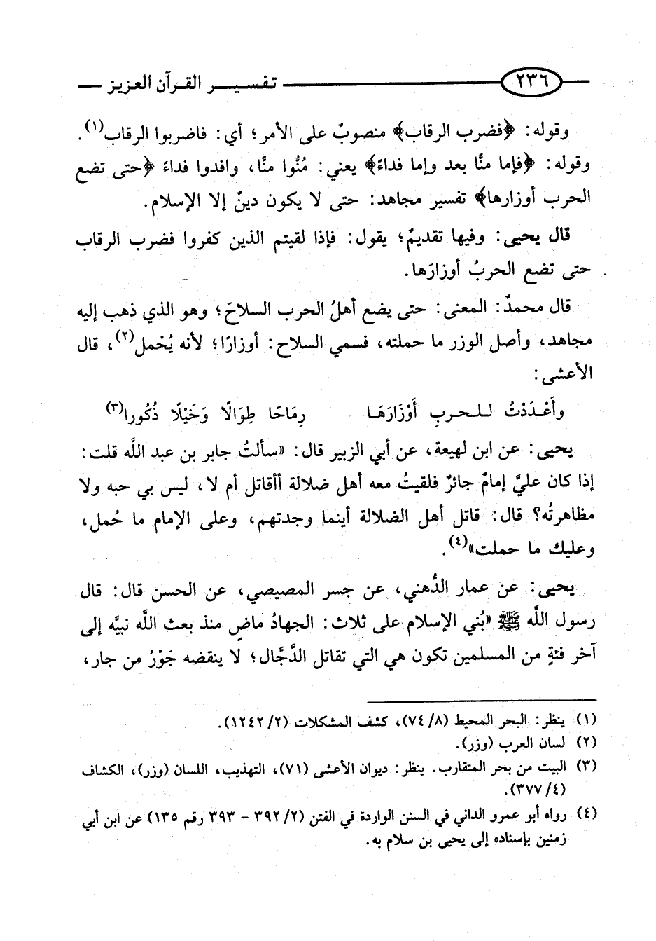 قَالَ محمدٌ: الْمَعْنى: حَتَّى يضع أهلُ الْحَرْب السَّلَام؛ وَهُوَ الَّذِي ذهب إِلَيْهِ مُجَاهِد، وأصل الْوزر مَا حَملته، فَسُمي السِّلَاح: أوزارًا؛ لِأَنَّهُ يُحْمل، قَالَ الْأَعْشَى: