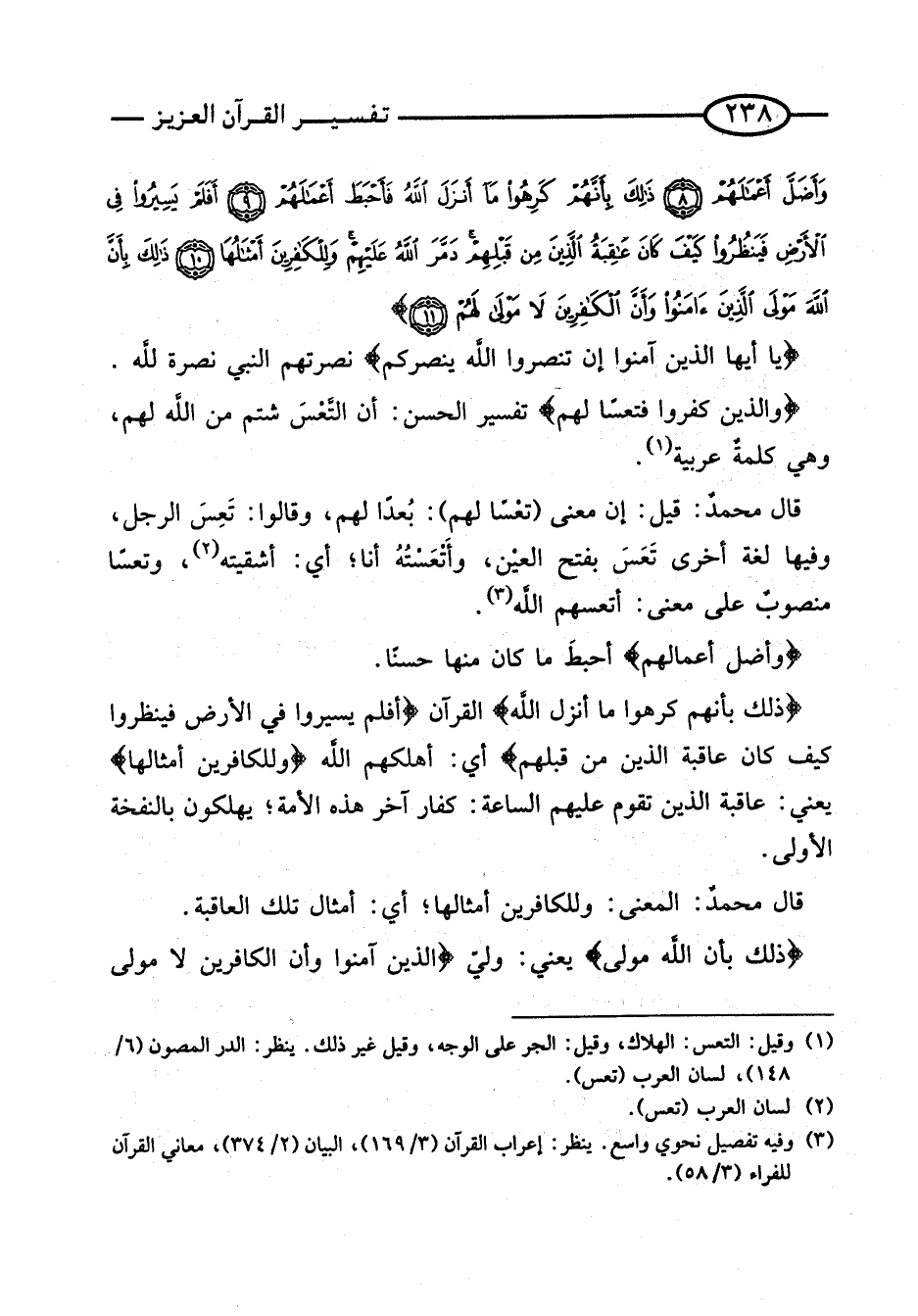 {وَالَّذين كفرُوا فتعسا لَهُم} تَفْسِير الْحسن: أَن التَّعْسَ شتم من اللَّه لَهُم، وَهِي كلمةٌ عَرَبِيَّة.