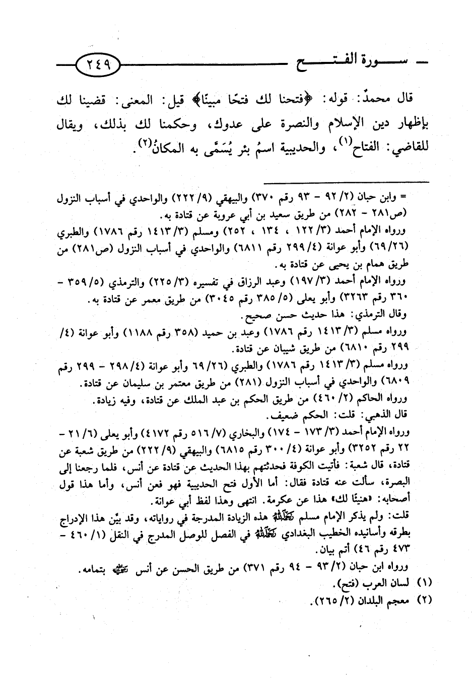قَالَ محمدٌ: قَوْله: {فَتَحْنَا لَكَ فتحا مُبينًا} قبل: الْمَعْنى: قضينا لَك بِإِظْهَار دين الْإِسْلَام والنصرة على عَدوك، وحكمنا لَك بذلك، وَيُقَال للْقَاضِي: الفتاح، وَالْحُدَيْبِيَة اسمُ بِئْر يُسَمَّى بِهِ الْمَكَان.