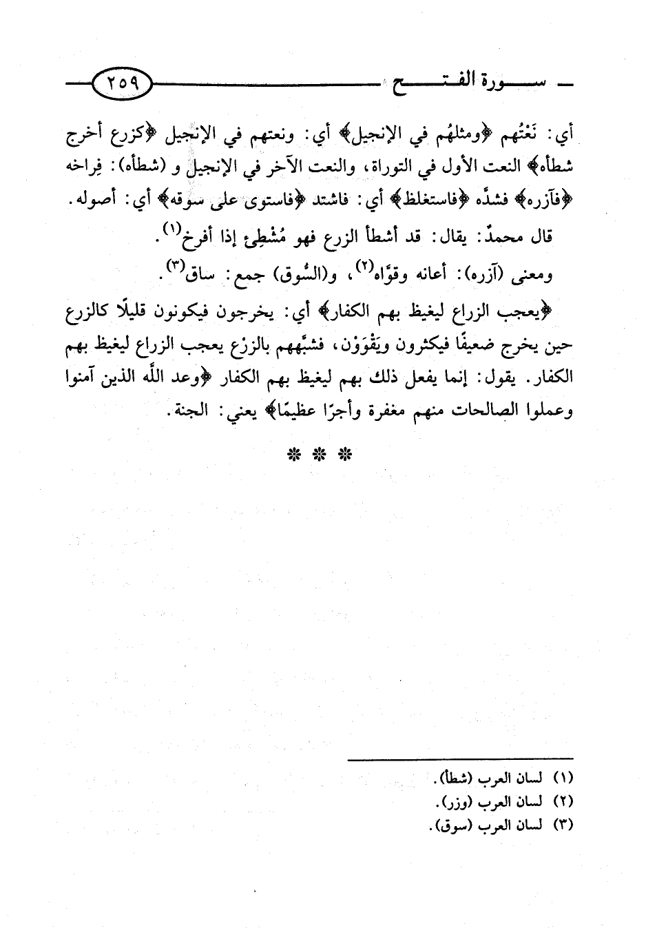 أَي: نَعْتُهم {وَمَثَلُهُمْ فِي الإِنْجِيلِ} أَي: ونعتهم فِي الْإِنْجِيل {كَزَرْعٍ أخرج شطأه} النَّعْت الأول فِي التَّوْرَاة، والنعت الآخر فِي الْإِنْجِيل و (شطأه): فِرَاخه {فآزره} فشده {فاستغلظ} أَي: فَاشْتَدَّ {فَاسْتَوَى عَلَى سُوقِهِ} أَي: أُصُوله