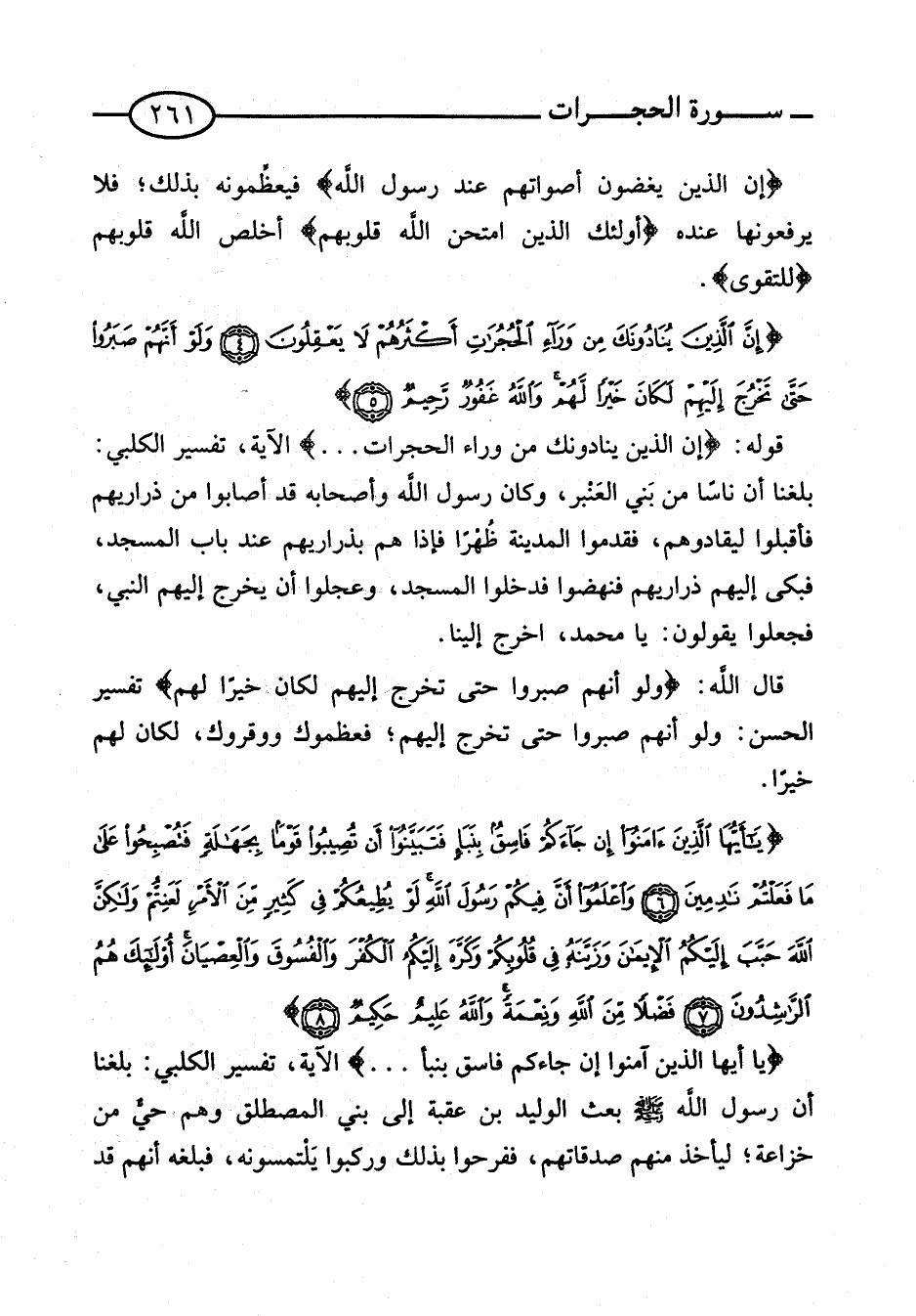 قَوْله: {إِنَّ الَّذِينَ يُنَادُونَكَ مِنْ وَرَاء الحجرات} الْآيَة، تَفْسِير الْكَلْبِيّ: بلغنَا أَن نَاسا من بَني العَنْبر، وَكَانَ رَسُول الله وَأَصْحَابه قد أَصَابُوا من ذَرَارِيهمْ فَأَقْبَلُوا ليقادوهم، فقدموا الْمَدِينَة ظُهْرًا فَإِذا هم بذراريهم عِنْد بَاب الْمَسْجِد، فَبكى إِلَيْهِم ذَرَارِيهمْ فنهضوا فَدَخَلُوا الْمَسْجِد، وعجلوا أَن يخرج إِلَيْهِم النَّبِي، فَجعلُوا يَقُولُونَ: يَا مُحَمَّد، اخْرُج إِلَيْنَا.