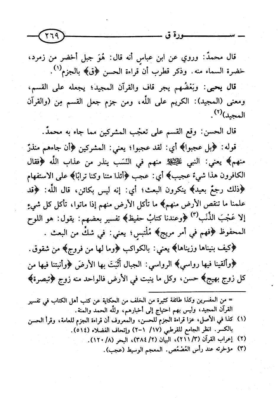 قَالَ محمدٌ: وَرُوِيَ عَن ابْن عَبَّاس أَنه قَالَ: هُوَ جبل أَخْضَر من زمرد، خضرَة السَّمَاء مِنْهُ. وَذكر قطرب أَن قِرَاءَة الْحسن {ق} بِالْجَزْمِ.