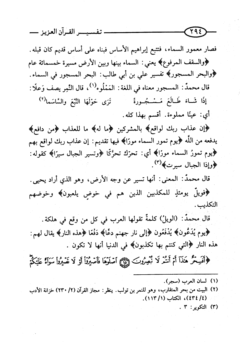قَالَ محمدٌ: الْمَسْجُور مَعْنَاهُ فِي اللُّغَة: المَمْلُوء، قَالَ النَّمِر يصف وَعلًا: