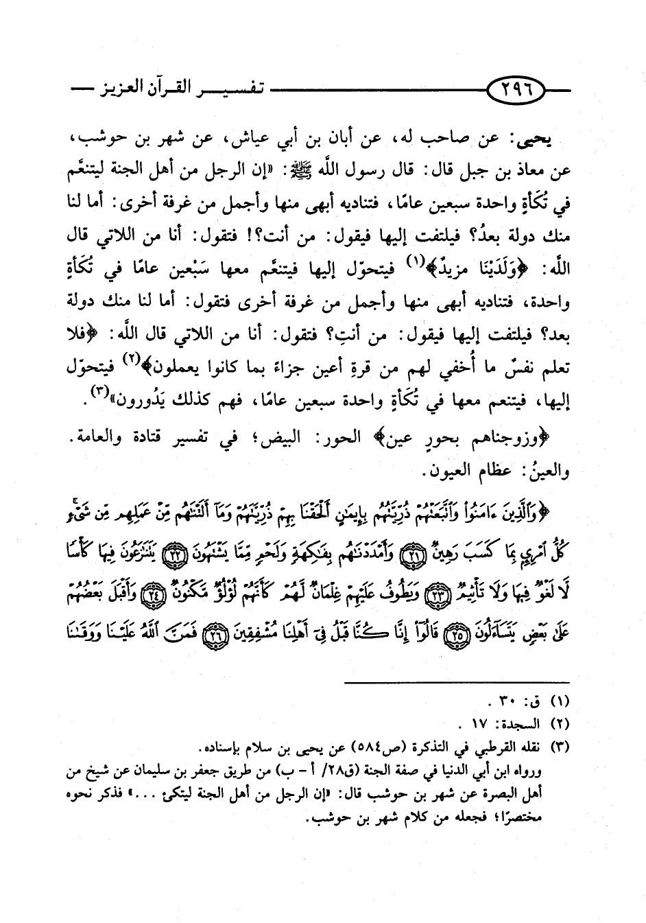 يحيى: عَنْ صَاحِبٍ لَهُ، عَنْ أَبَانَ بْنِ أَبِي عَيَّاشٍ، عَنْ شَهْرِ بْنِ حَوْشَبٍ، عَنْ مُعَاذِ بْنِ جَبَلٍ قَالَ: قَالَ رَسُولُ اللَّهِ صَلَّى اللَّهُ عَلَيْهِ وَسَلَّمَ: " إِنَّ الرَّجُلَ مِنْ أَهْلِ الْجَنَّةِ لَيَتَنَعَّمُ فِي تُكَأَةٍ وَاحِدَةٍ سَبْعِينَ عَامًا، فَتُنَادِيهِ أَبْهَى مِنْهَا وَأَجْمَلُ مِنْ غُرْفَةٍ أُخْرَى: أَمَا لَنَا مِنْكَ دَوْلَةٌ بَعْدُ؟ فَيَلْتَفِتُ إِلَيْهَا فَيَقُولُ: مَنْ أَنْتِ؟! فَتَقُولُ: أَنَا مِنَ اللاتِي قَالَ اللَّهُ: {وَلَدَيْنَا مزِيد} فَيَتَحَوَّلُ إِلَيْهَا فَيَتَنَعَّمُ مَعَهَا سَبْعِينَ عَامًا فِي تُكَأَةٍ وَاحِدَةٍ، فَتُنَادِيهِ أَبْهَى مِنْهَا وَأَجْمَلُ مِنْ غُرْفَةٍ أُخْرَى فَتَقُولُ: أَمَا لَنَا مِنْكَ دَوْلَةٌ بَعْدُ؟ فَيَلْتَفِتُ إِلَيْهَا فَيَقُولُ: مَنْ أَنْتِ؟ فَتَقُولُ: أَنَا مِنَ اللاتِي قَالَ اللَّهُ: {فَلا تَعْلَمُ نَفْسٌ مَا أُخْفِيَ لَهُمْ مِنْ قُرَّةِ أَعْيُنٍ جَزَاءً بِمَا كَانُوا يعْملُونَ} فَيَتَحَوَّلُ إِلَيْهَا، فَيَتَنَعَّمُ مَعَهَا فِي تُكَأَةٍ وَاحِدَةٍ سَبْعِينَ عَامًا، فَهُمْ كَذَلِكَ يَدُورُونَ ".