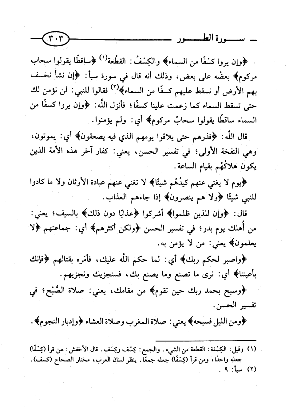 {وَإِنْ يَرَوْا كِسْفًا مِنَ السَّمَاءِ} والكِسْفُ: القطْعة {سَاقِطًا يَقُولُوا سَحَابٌ مركوم} بعضُه على بعض، وَذَلِكَ أَنه قَالَ فِي سُورَة سبأ: {إِنْ نَشَأْ نَخْسِفْ بِهِمُ الأَرْضَ أَوْ نُسْقِطْ عَلَيْهِمْ كِسَفًا من السَّمَاء} فَقَالُوا للنَّبِي: لن نؤمن لَك حَتَّى تُسْقِطَ السَّمَاءَ كَمَا زَعَمْتَ عَلَيْنَا كسفاً؛ فَأنْزل اللَّه: {وَإِنْ يَرَوْا كِسْفًا مِنَ السَّمَاءِ سَاقِطًا يَقُولُوا سَحَابٌ مركوم} أَي: وَلم يُؤمنُوا.