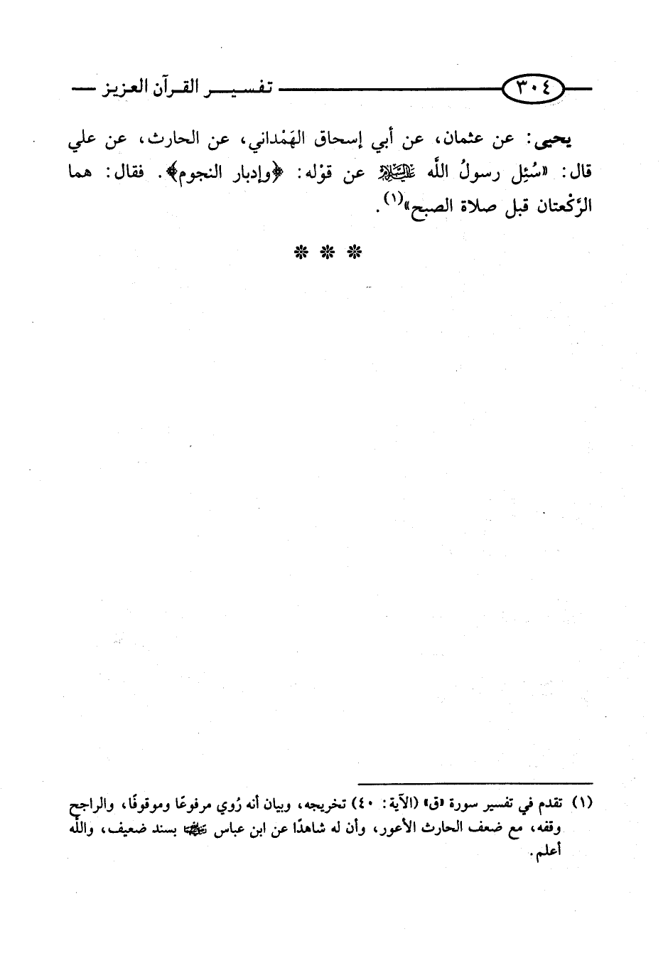يَحْيَى: عَنْ عُثْمَانَ، عَنْ أَبِي إِسْحَاقَ الْهَمْدَانِيِّ، عَنِ الْحَارِثِ، عَنْ عَلِيٍّ قَالَ: " سُئِلَ رَسُولُ اللَّهِ صَلَّى اللَّهُ عَلَيْهِ وَسَلَّمَ عَنِ قَوْله: {وإدبار النُّجُوم}. فَقَالَ: هُمَا الرَّكْعَتَانِ قَبْلَ صَلاةِ الصُّبْح ".