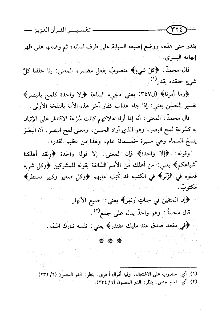 قَالَ مُحَمَّد: {كُلُّ شَيْءٍ} منصوبٌ بِفعل مُضْمر، الْمَعْنى: إِنَّا خلقنَا كلَّ شيءٍ خلقناه بِقدر.