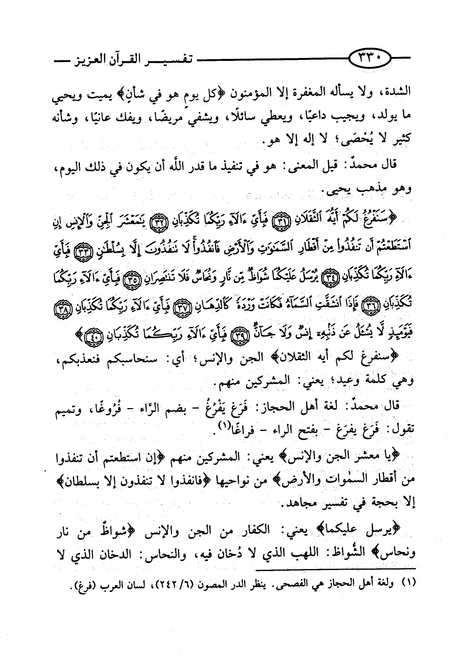 {يَا معشر الْجِنّ وَالْإِنْس} يَعْنِي: الْمُشْركين مِنْهُم {إِنِ اسْتَطَعْتُمْ أَن تنفذوا من أقطار السَّمَاوَات وَالْأَرْض} من نَوَاحِيهَا (فَانفُذُوا لاَ تَنفُذُونَ إِلاَ بِسُلْطَانٍ إِلَّا بِحجَّة فِي تَفْسِير مُجَاهِد.