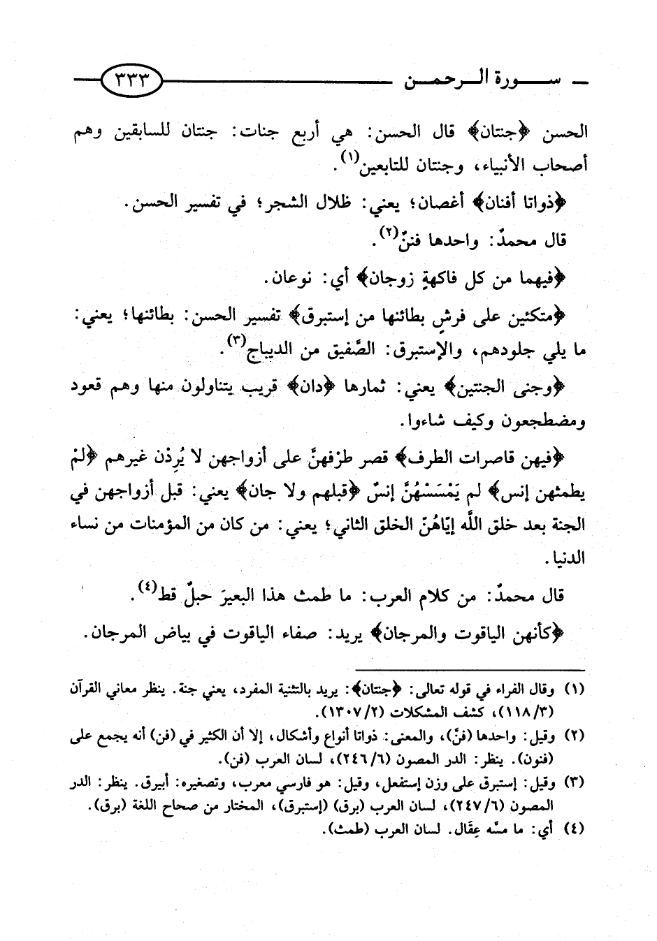 الْحسن {جنتان} قَالَ الْحسن: هِيَ أَربع جنَّات: جنتان للسابقين وهم أَصْحَاب الْأَنْبِيَاء، وجنتان للتابعين.