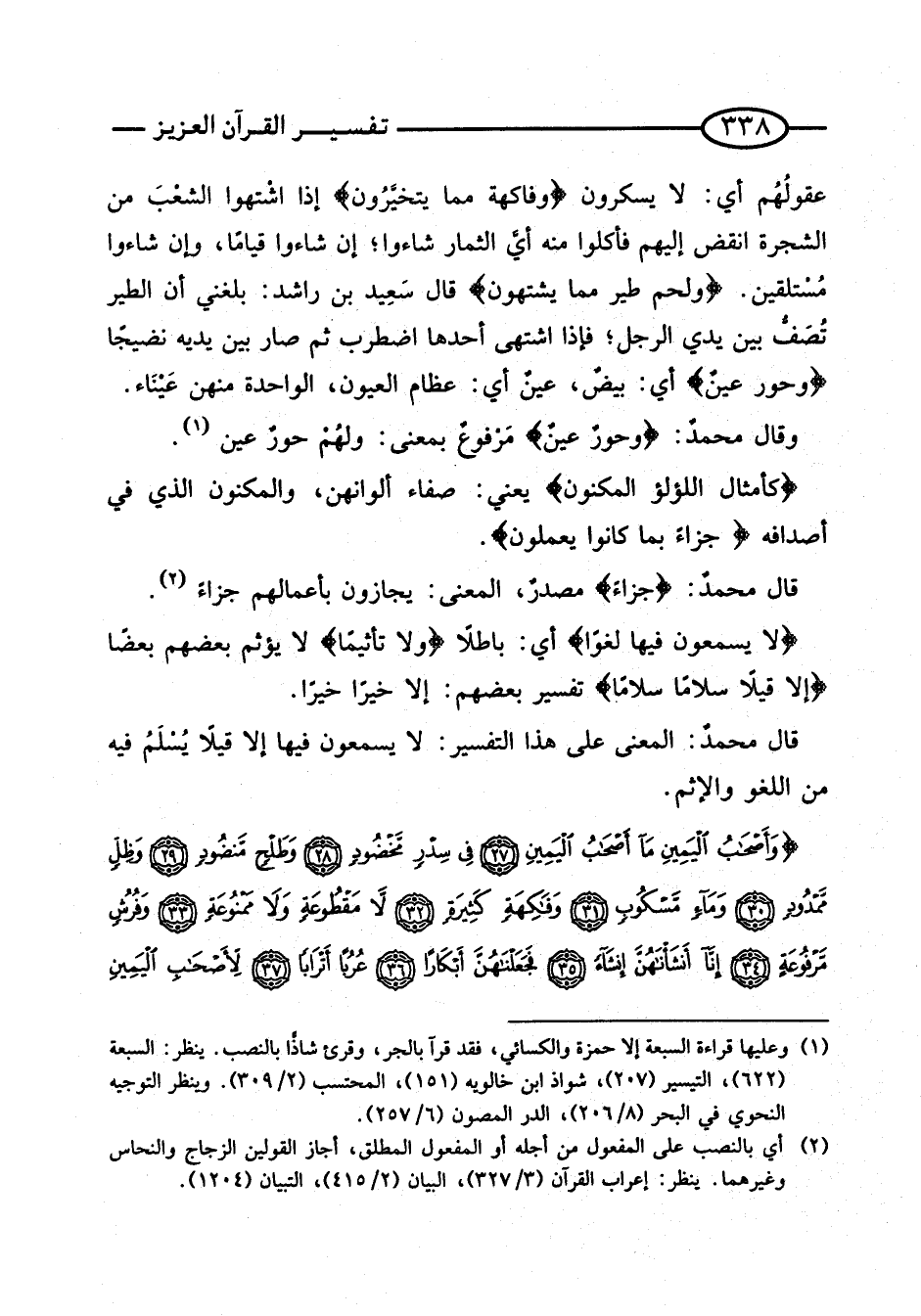 {وَلحم طير مِمَّا يشتهون} قَالَ سَعِيد بْن رَاشد: بَلغنِي أَن الطير تُصَفُّ بَين يَدي الرجل؛ فَإِذا اشْتهى أَحدهَا اضْطربَ ثمَّ صَار بَين يَدَيْهِ نَضِيجًا