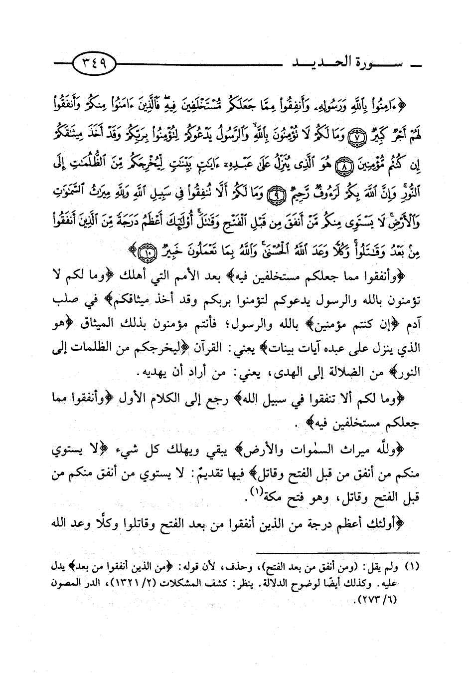 {وَللَّه مِيرَاث السَّمَاوَات وَالْأَرْض} يبقي وَيهْلك كل شَيْء {لَا يَسْتَوِي مِنْكُمْ مَنْ أَنْفَقَ مِنْ قبل الْفَتْح وَقَاتل} فِيهَا تقديمٌ: لَا يَسْتَوِي من أنْفق مِنْكُم من قبل الْفَتْح وَقَاتل، وَهُوَ فتح مَكَّة.