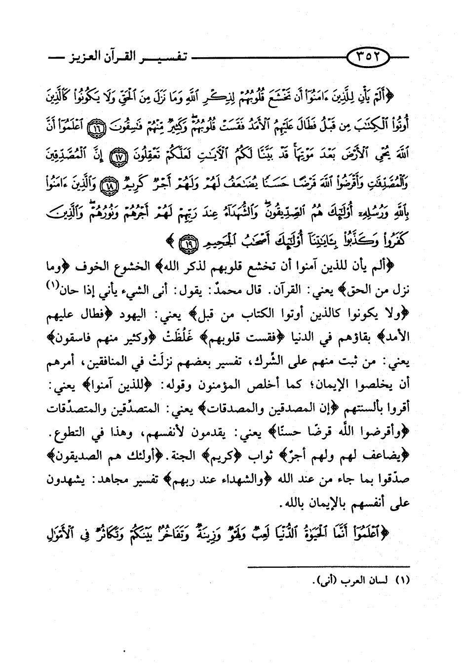 {أَلَمْ يَأْنِ لِلَّذِينَ آمَنُوا أَنْ تخشع قُلُوبهم لذكر الله} الْخُشُوع الْخَوْف {وَمَا نَزَلَ مِنَ الْحق} يَعْنِي: الْقُرْآن. قَالَ محمدٌ: يَقُول: أَنى الشَّيْء يأني إِذا حَان {وَلا يَكُونُوا كَالَّذِينَ أُوتُوا الْكِتَابَ من قبل} يَعْنِي: الْيَهُود {فَطَالَ عَلَيْهِمُ الأَمَدُ} بقاؤهم فِي الدُّنْيَا {فَقَسَتْ قُلُوبُهُمْ} غلظت {وَكثير مِنْهُم فَاسِقُونَ} يَعْنِي: مَنْ ثَبَتَ مِنْهُمْ عَلَى الشِّرك، تَفْسِير بَعضهم نزلَتْ فِي الْمُنَافِقين، أَمرهم أَن يخلصوا الْإِيمَان؛ كَمَا أخْلص الْمُؤْمِنُونَ وَقَوله: {لِلَّذِينَ آمنُوا} يَعْنِي: أقرُّوا بألسنتهم