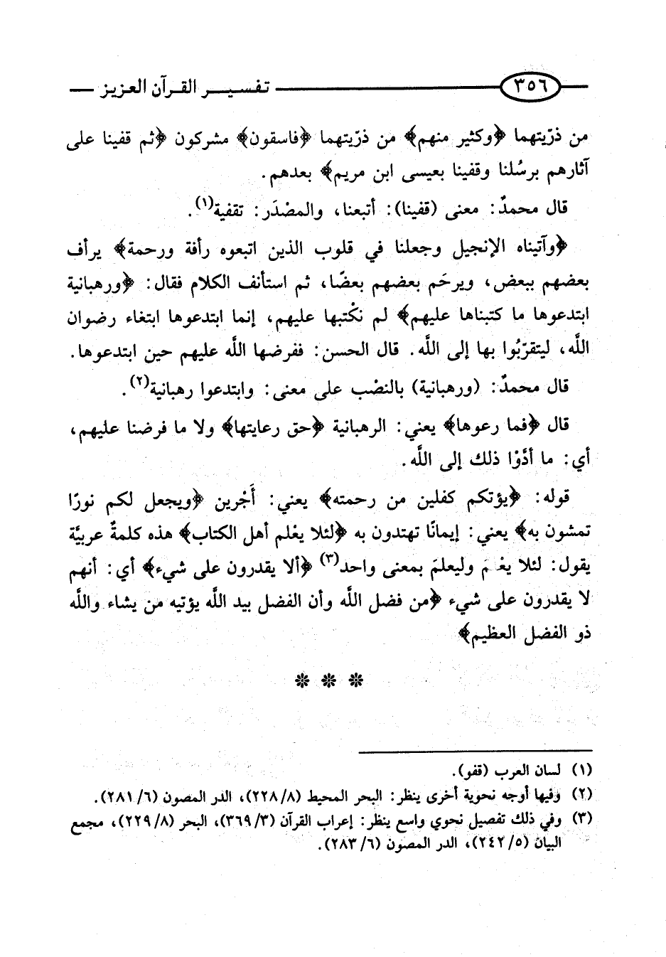 {وَآتَيْنَاهُ الإِنْجِيلَ وَجَعَلْنَا فِي قُلُوبِ الَّذِينَ اتَّبَعُوهُ رأفة وَرَحْمَة} يرأف بَعضهم بِبَعْض، ويرحَم بَعضهم بَعْضًا، ثمَّ اسْتَأْنف الْكَلَام فَقَالَ: {وَرَهْبَانِيَّةً ابْتَدَعُوهَا مَا كَتَبْنَاهَا عَلَيْهِمْ} لم نكْتبها عَلَيْهِم، إِنَّمَا ابتدعوها ابْتِغَاء رضوَان اللَّه ليتقربُوا بهَا إِلَى اللَّه. قَالَ الْحسن: ففرضها اللَّه عَلَيْهِم حِين ابتدعوها.
