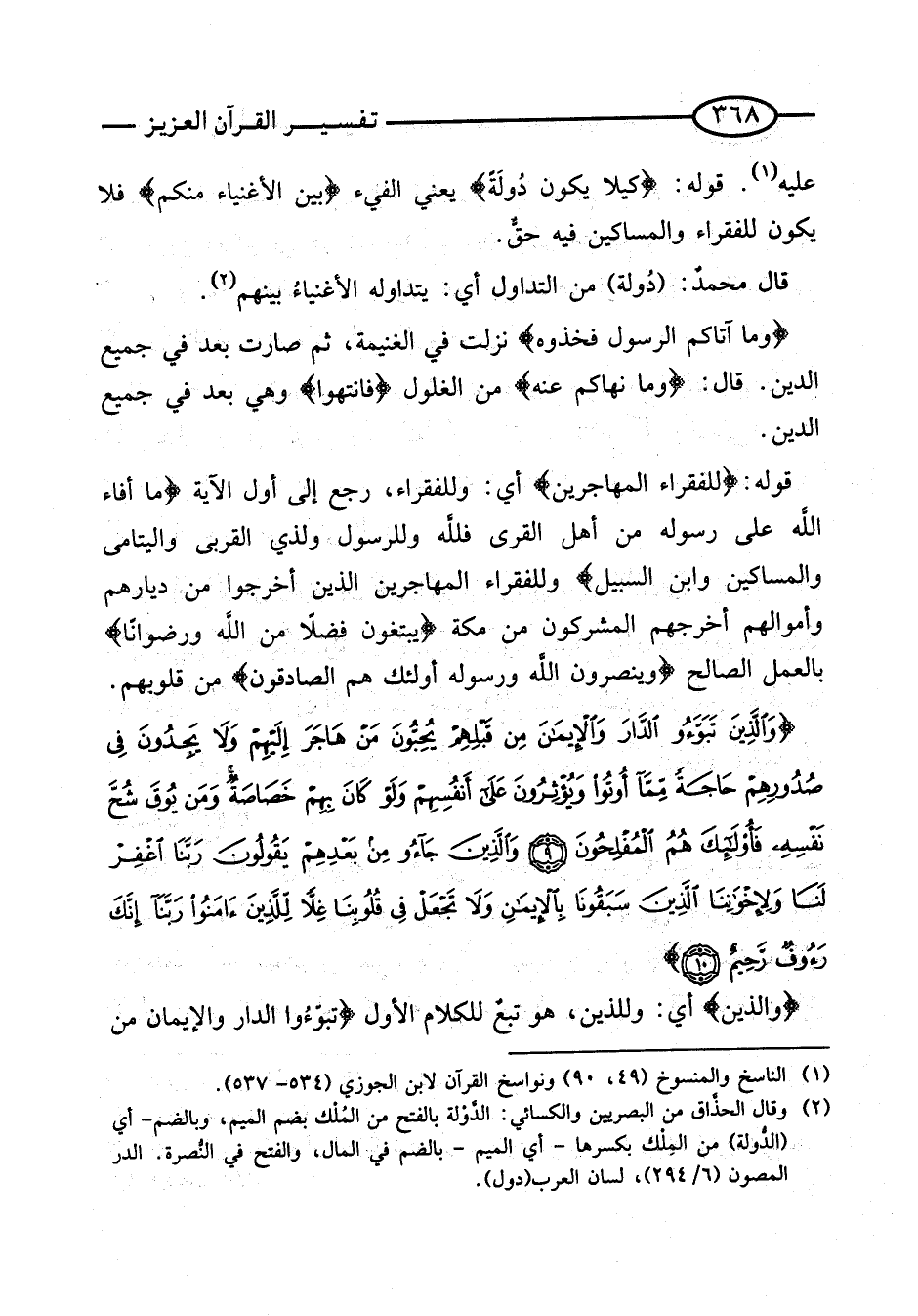 عَلَيْهِ. قَوْله: {كَيْلاَ يَكُونَ دُولَةً} يَعْنِي الْفَيْء {بَيْنَ الأَغْنِيَاءِ مِنْكُمْ} فَلَا يكون للْفُقَرَاء وَالْمَسَاكِين فِيهِ حق.