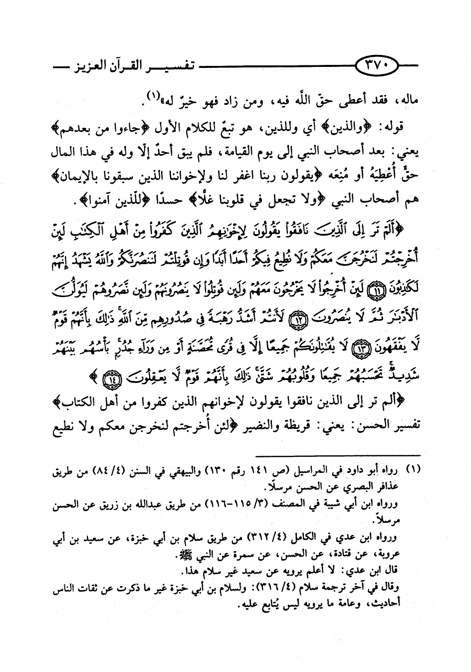 {أَلَمْ تَرَ إِلَى الَّذِينَ نَافَقُوا يَقُولُونَ لإِخْوَانِهِمُ الَّذِينَ كَفَرُوا مِنْ أهل الْكتاب} تَفْسِير الْحسن: يَعْنِي: قُرَيْظَة وَالنضير (لَئِنْ أُخْرِجْتُمْ لَنَخْرُجَنَّ مَعَكُمْ وَلاَ نُطِيعُ