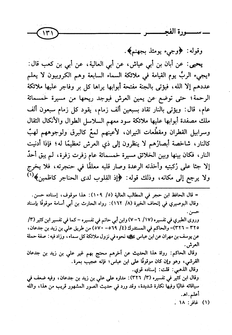 يَحْيَى: عَنْ أَبَانِ بْنِ أَبِي عَيَّاشٍ، عَنْ أَبِي الْعَالِيَةِ، عَنْ أُبَيِّ بْنِ كَعْبٍ قَالَ: " يَجِيءُ الرَّبُّ يَوْمَ الْقِيَامَةِ فِي مَلائِكَةِ السَّمَاءِ السَّابِعَةِ وَهُمُ الْكَرْوبِيُّونَ لَا يَعْلَمُ عَدَدَهُمْ إِلا اللَّهُ، فَيُؤْتَى بِالْجَنَّةِ مُفْتَحَةٌ أَبْوَابُهَا يَرَاهَا كُلُّ بَرٍّ وَفَاجِرٍ عَلَيْهَا مَلائِكَةُ الرَّحْمَةِ، حَتَّى تُوضَعَ عَنْ يَمِينِ الْعَرْشِ فيوجد رِيحهَا من مسيرَة خَمْسمِائَة عَامٍ، قَالَ: وَيُؤْتَى بِالنَّارِ تُقَادُ بِسَبْعِينَ أَلْفَ زِمَامٍ، يَقُودُ كُلَّ زِمَامٍ سَبْعُونَ أَلْفَ مَلَكٍ مُصَفَّدَةٌ أَبْوَابُهَا عَلَيْهَا مَلائِكَةٌ سُودٌ مَعَهُمْ السَّلاسِلُ الطِّوَالُ وَالأَنْكَالُ الثِّقَالُ وَسَرَابِيلُ الْقَطِرَانِ وَمُقَطِّعَاتُ النِّيرَانِ، لأَعْيُنِهِمْ لَمْعٌ كَالْبَرْقِ وَلِوُجُوهِهِمْ لَهَبٌ كَالنَّارِ، شَاخِصَةٌ أَبْصَارُهُمْ لَا يَنْظُرُونَ إِلَى ذِي الْعَرْشِ تَعْظِيمًا لَهُ، فَإِذَا أُدْنِيَتِ النَّارُ، فَكَانَ بَيْنَهَا وَبَيْنَ الْخَلائِقِ مسيرَة خَمْسمِائَة عَامٍ زَفَرَتْ زَفْرَةً، لمْ يَبْقَ أَحَدٌ إِلَّا جَثَا عَلَى رُكْبَتَيْهِ وَأَخَذَتْهُ الرَّعْدَةُ وَصَارَ قَلْبَهُ معلقاُ فِي حَنْجَرَتِهِ، فَلا يَخْرُجُ وَلا يَرْجِعُ إِلَى مَكَانِهِ، وَذَلِكَ قَوْلُهُ: {إِذِ الْقُلُوبُ لَدَى الْحَنَاجِرِ كَاظِمِينَ}