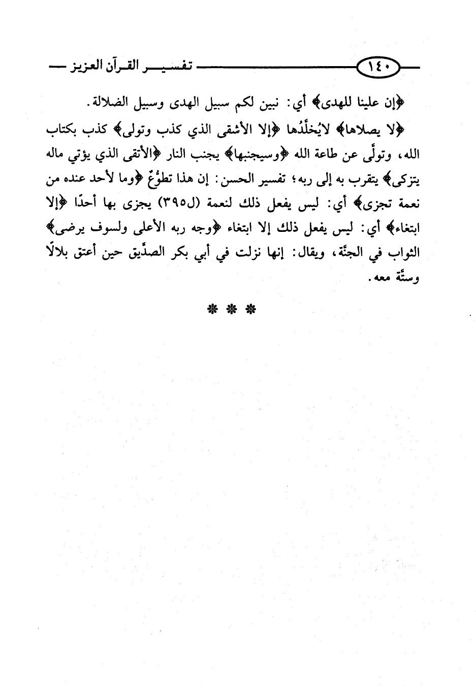 {إِلَّا ابْتِغَاء} أَيْ: لَيْسَ يَفْعَلُ ذَلِكَ إِلَّا ابْتِغَاءَ {وَجْهِ رَبِّهِ الأَعْلَى وَلَسَوْفَ يرضى} الثَّوَابَ فِي الْجَنَّةِ، وَيُقَالُ: إِنَّهَا نَزَلَتْ فِي أَبِي بَكْرٍ الصِّدِّيقِ حِينَ أَعْتَقَ بِلالًا وَسِتَّةً مَعَهُ.